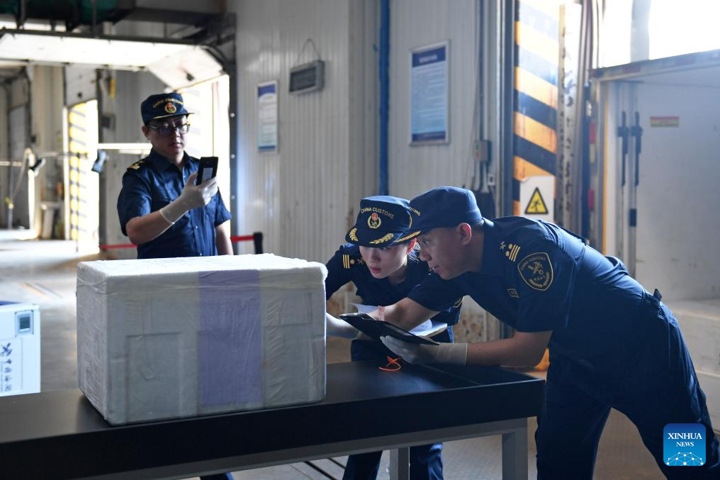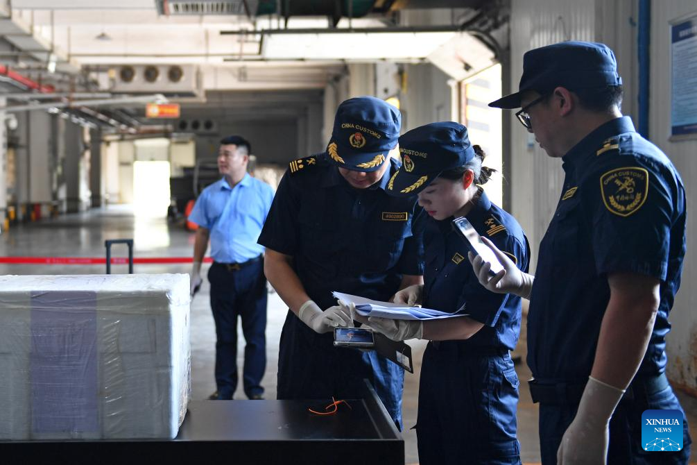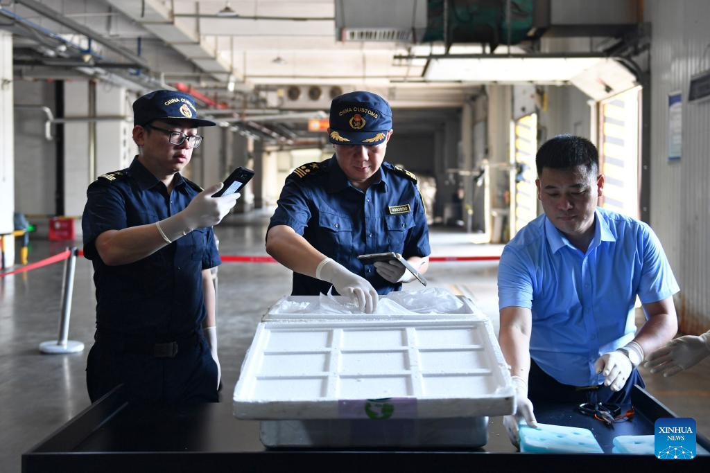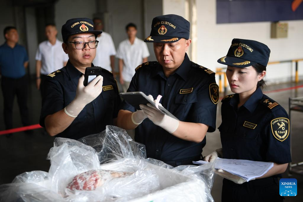Customs officials conduct an on-site inspection of the frozen mutton shipment in Changsha, central China's Hunan Province, Sept. 8, 2024. A shipment of mutton from Madagascar was cleared at Changsha Customs in central China's Hunan Province on Sunday, marking China's first mutton imports from Africa and an important breakthrough in China-Africa meat trade.