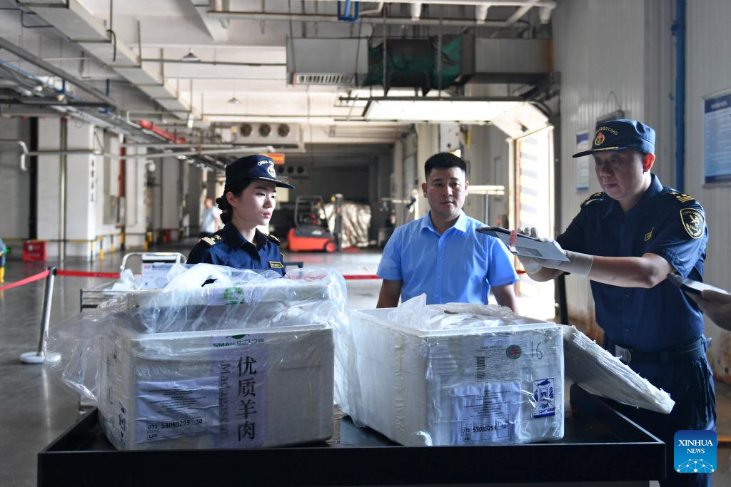 Customs officials conducted an on-site inspection of the frozen mutton shipment, weighing 1,000 kg in total. (Xinhua/Chen Zhenhai)