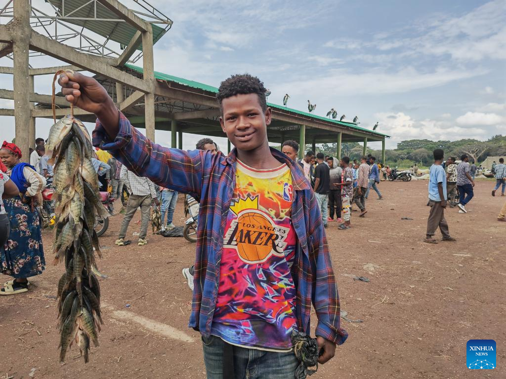 This photo taken with a cellphone shows that a vendor displaying his fish at a fish market near Hawassa Lake in Hawassa, Ethiopia, on Sept. 14, 2024. Located about 270 kilometers south to Addis Ababa, capital of Ethiopia, Hawassa Lake and the fish market nearby have been a draw for both locals and visitors for decades. (Xinhua/Liu Fangqiang)