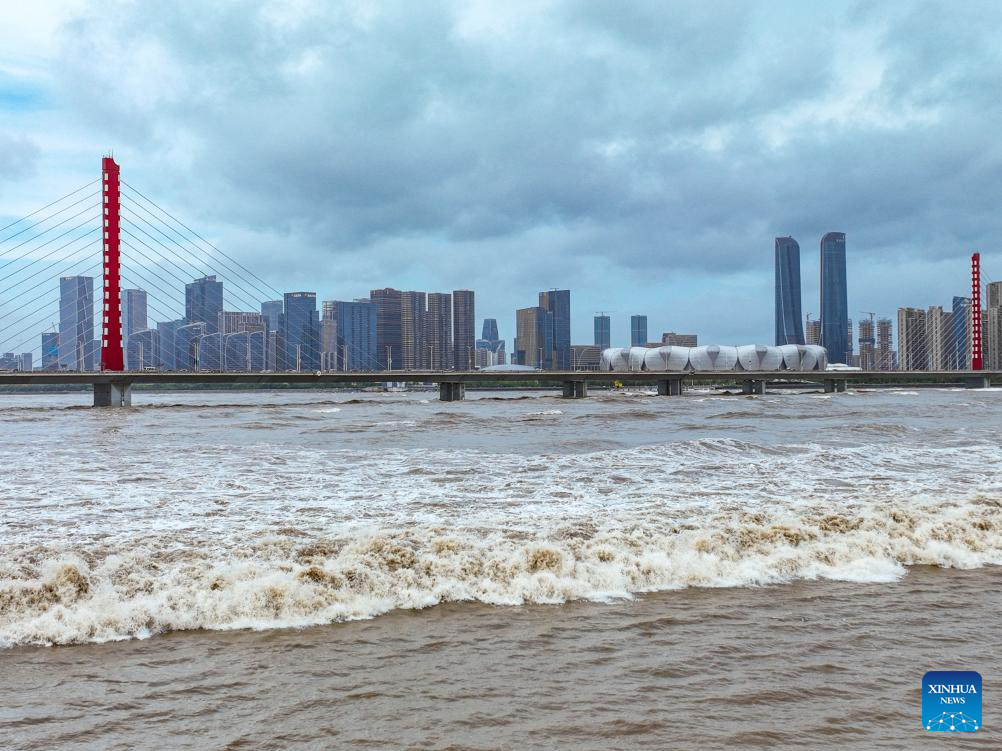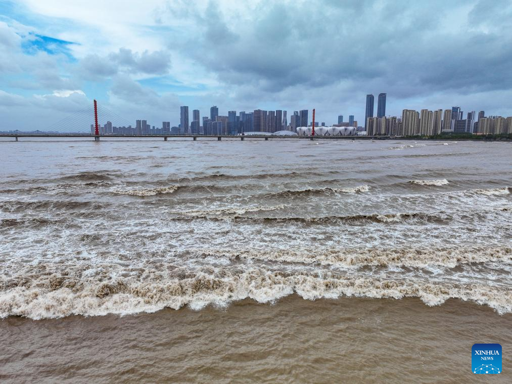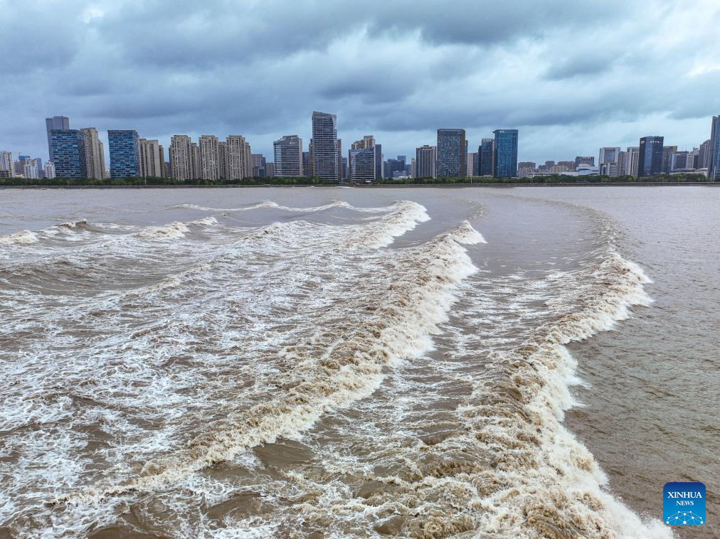This aerial drone photo taken on Sept. 19, 2024 shows waves caused by the Qiantang River tidal bore in Hangzhou, east China's Zhejiang Province. (Xinhua/Jiang Han)