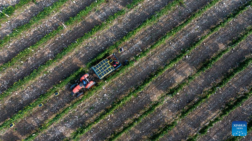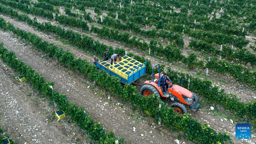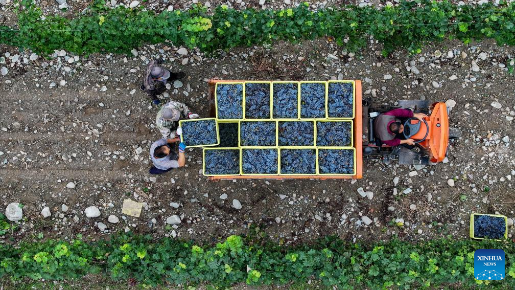 An aerial drone photo taken on Sept. 19, 2024 shows farmers transporting harvested grapes in a vineyard at the eastern foot of Helan Mountain in northwest China's Ningxia Hui Autonomous Region. With a dry climate and abundant sunshine, the eastern foot of Helan Mountain is widely regarded as a "golden zone" for wine grape cultivation and high-end wine production. The region has entered this year's harvest season of the wine grape recently. (Xinhua/Wang Peng)