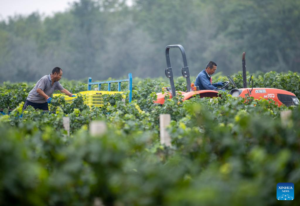 Farmers transport harvested grapes in a vineyard at the eastern foot of Helan Mountain in northwest China's Ningxia Hui Autonomous Region, Sept. 19, 2024. With a dry climate and abundant sunshine, the eastern foot of Helan Mountain is widely regarded as a "golden zone" for wine grape cultivation and high-end wine production. The region has entered this year's harvest season of the wine grape recently. (Xinhua/Yang Zhisen)