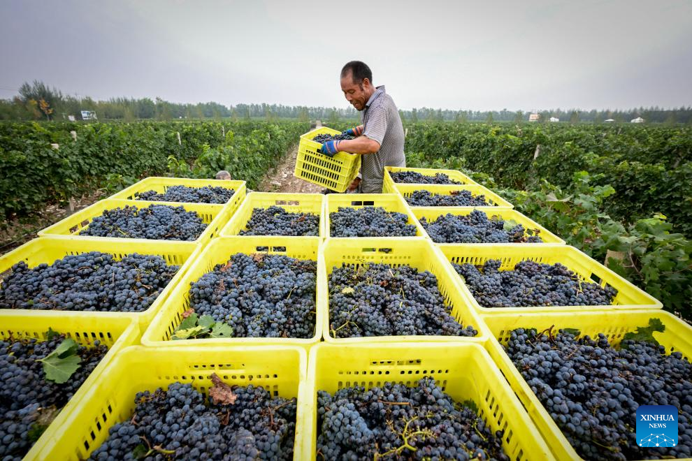 Freshly-harvested grapes are pictured in a vineyard at the eastern foot of Helan Mountain in northwest China's Ningxia Hui Autonomous Region, Sept. 19, 2024. With a dry climate and abundant sunshine, the eastern foot of Helan Mountain is widely regarded as a "golden zone" for wine grape cultivation and high-end wine production. The region has entered this year's harvest season of the wine grape recently. (Xinhua/Feng Kaihua)