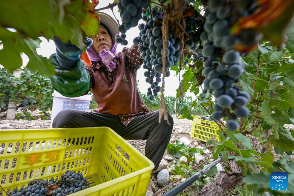 A farmer harvests grapes in a vineyard at the eastern foot of Helan Mountain in northwest China's Ningxia Hui Autonomous Region, Sept. 19, 2024. With a dry climate and abundant sunshine, the eastern foot of Helan Mountain is widely regarded as a "golden zone" for wine grape cultivation and high-end wine production. The region has entered this year's harvest season of the wine grape recently. (Xinhua/Yang Zhisen)