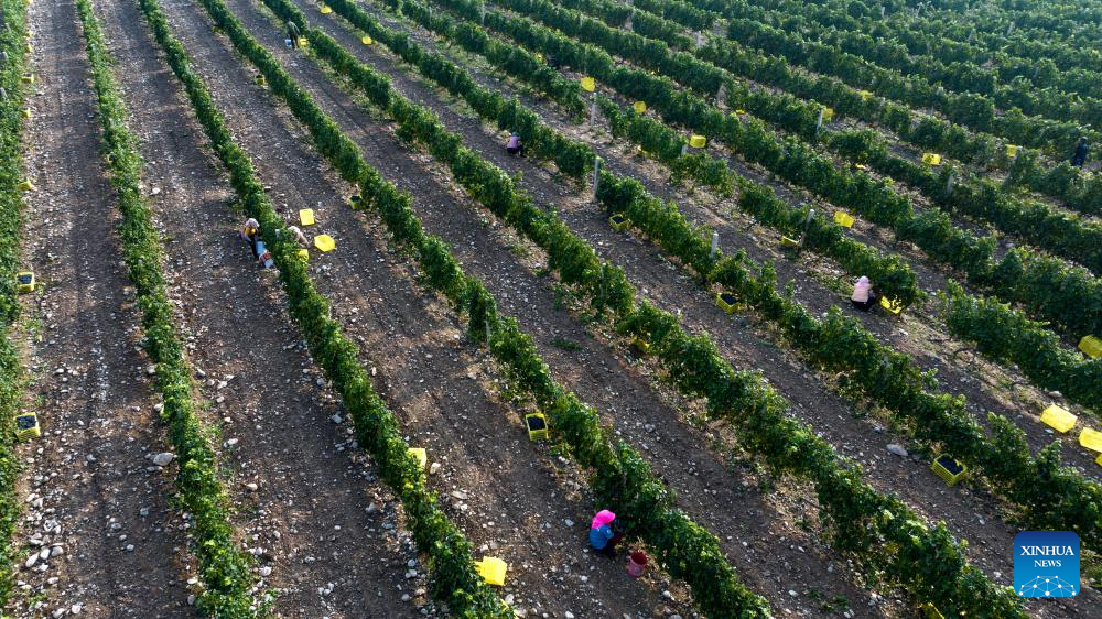 An aerial drone photo taken on Sept. 19, 2024 shows farmers harvesting grapes in a vineyard at the eastern foot of Helan Mountain in northwest China's Ningxia Hui Autonomous Region. With a dry climate and abundant sunshine, the eastern foot of Helan Mountain is widely regarded as a "golden zone" for wine grape cultivation and high-end wine production. The region has entered this year's harvest season of the wine grape recently. (Xinhua/Wang Peng)