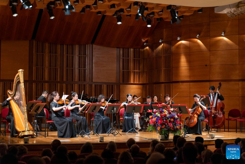Chinese musicians perform at a concert in Warsaw, Poland, Sept. 22, 2024. A concert was held here on Sunday night to celebrate the 75th anniversary of the founding of the People's Republic of China and the 75th anniversary of the establishment of diplomatic relations between China and Poland. Co-hosted by the Ministry of Culture and Tourism of China and the Chinese Embassy in Poland, the concert was performed by musicians from the China National Opera and Dance Drama Theater, together with Polish musicians. (Xinhua/Xia Yuanyi)