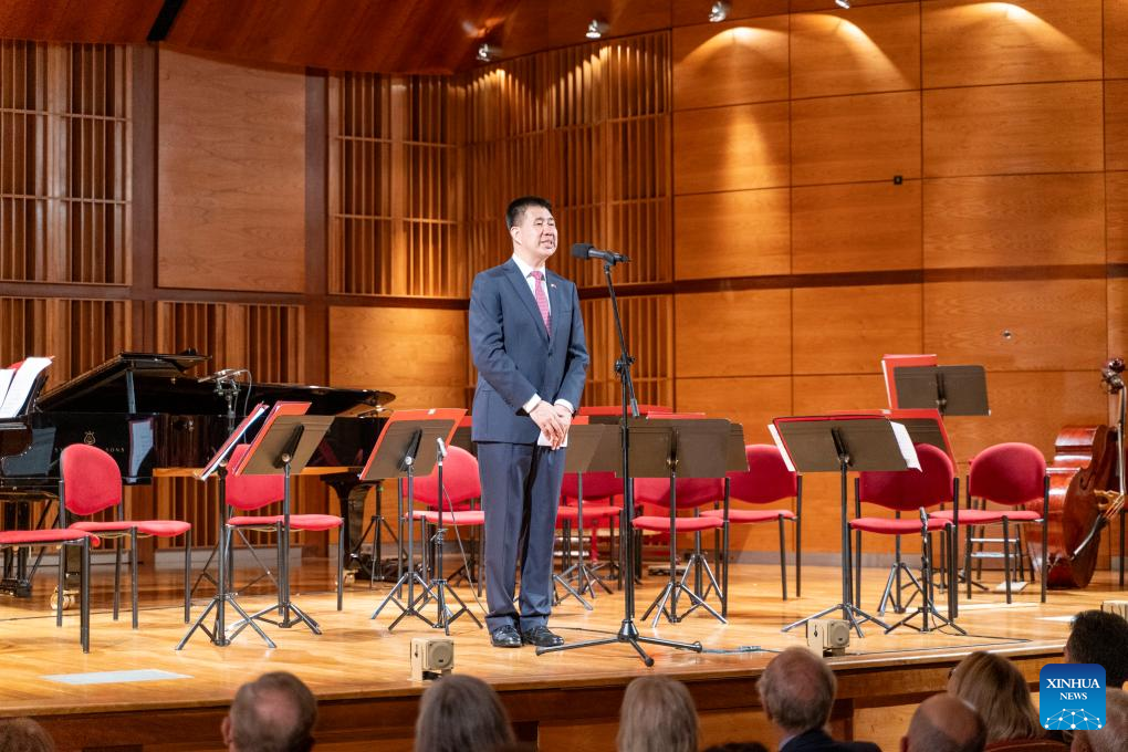 Sun Linjiang, Chinese ambassador to Poland, delivers a speech at a concert in Warsaw, Poland, Sept. 22, 2024.