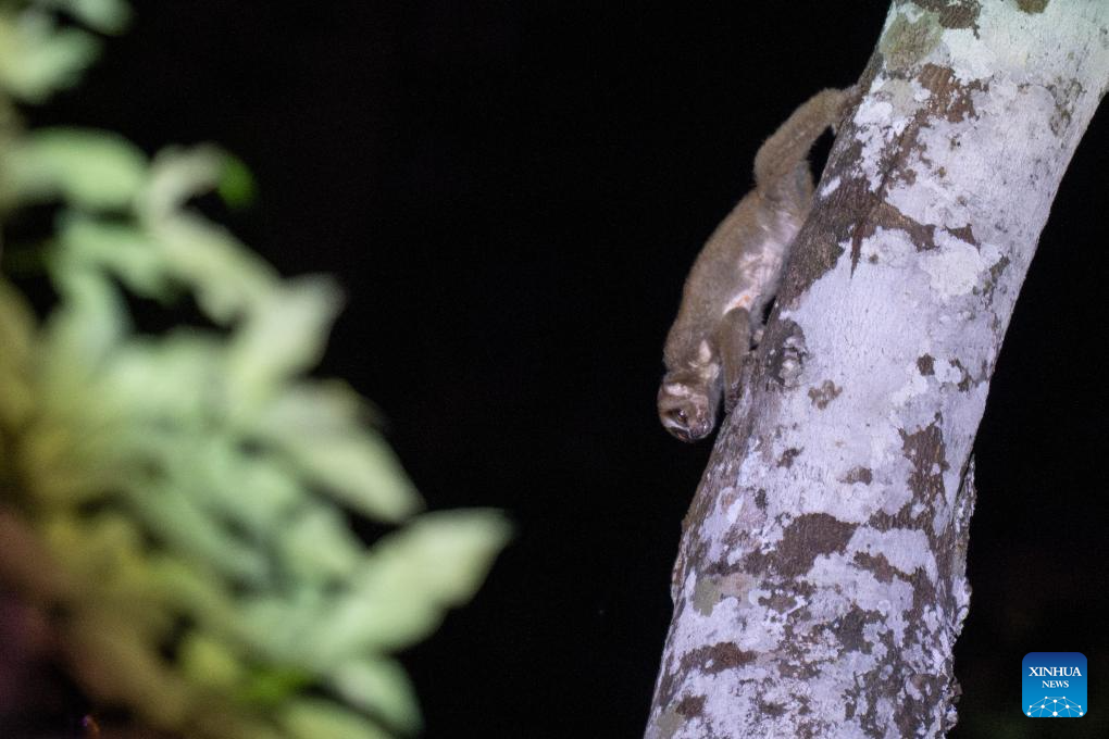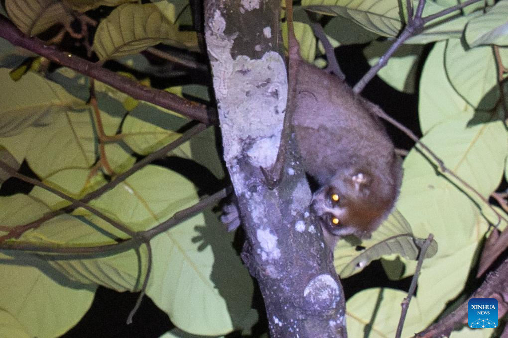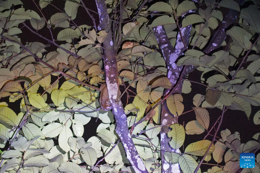 A wild Sunda slow loris is pictured in the forest of Singapore's Central Catchment Nature Reserve, on Oct. 7, 2024. (Photo by Then Chih Wey/Xinhua)