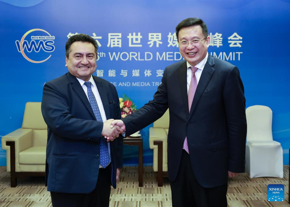 President of Xinhua News Agency Fu Hua meets with Felix Alberto Paz Quiroz, general director of the Peruvian news agency Andina, who is in China for the sixth World Media Summit, in Beijing, capital of China, Oct. 12, 2024. (Xinhua/Wang Ye)