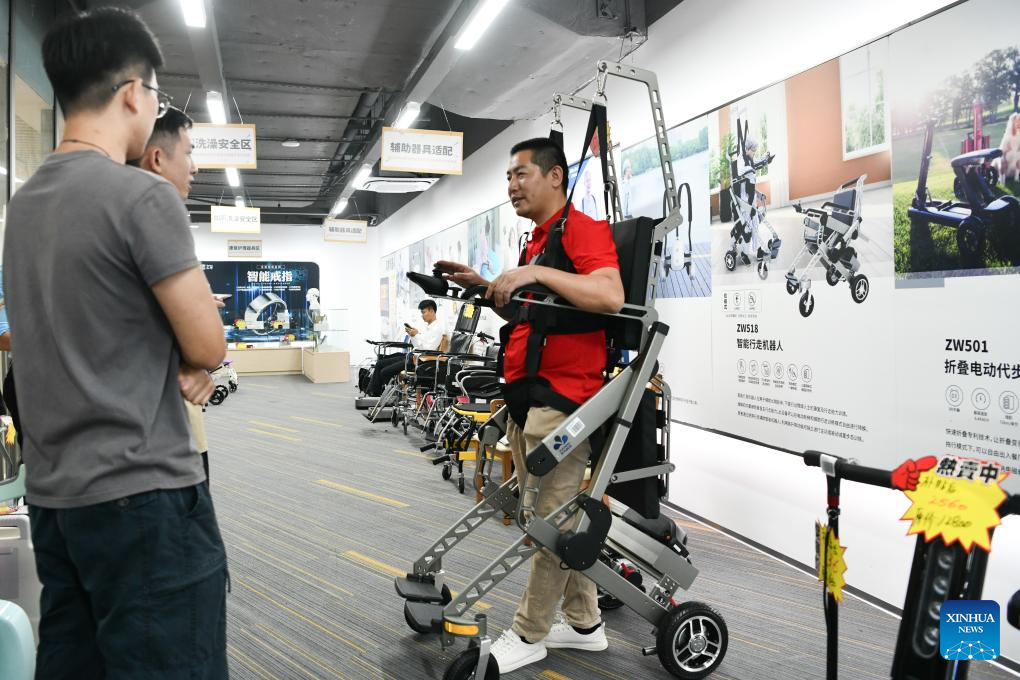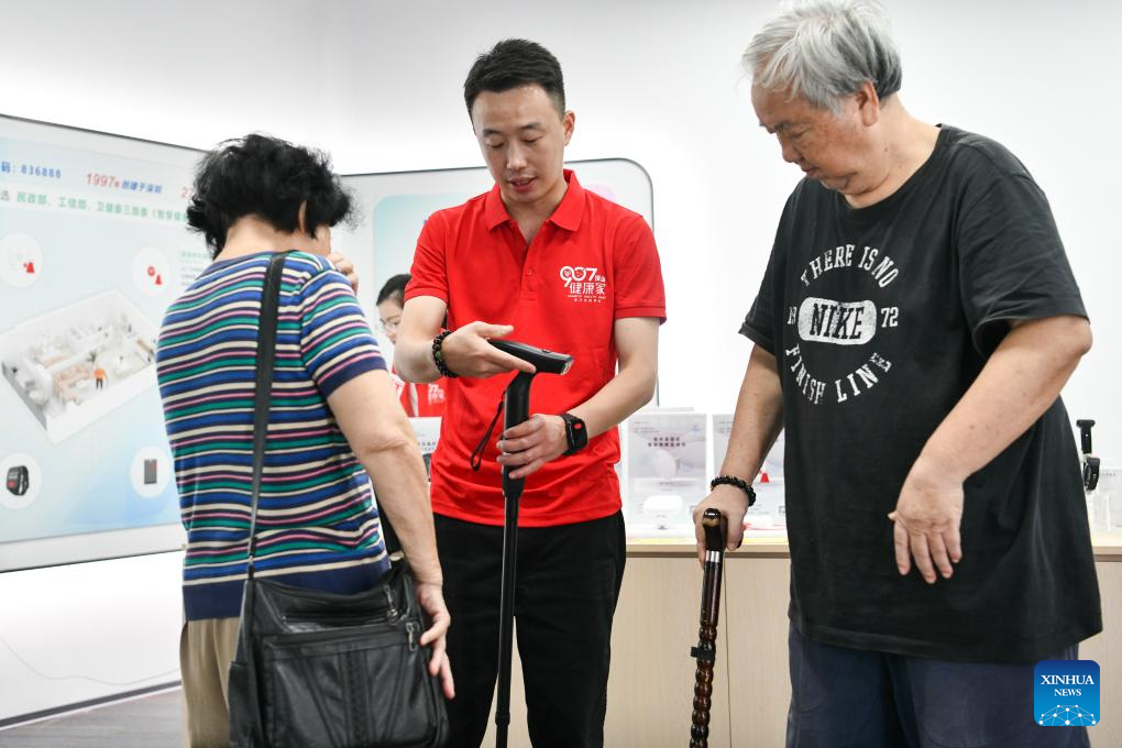 A customer tries a smart cane at an elderly product mall in Shenzhen, south China's Guangdong Province, Oct. 12, 2024. The elderly product mall in Shenzhen opened to the public recently, showcasing hundreds of smart home products under categories of home safety, entertainment, and intelligent caretaking, etc., meeting the citizens' needs for aging-friendly home renovation and living quality improvement. (Xinhua/Liang Xu)