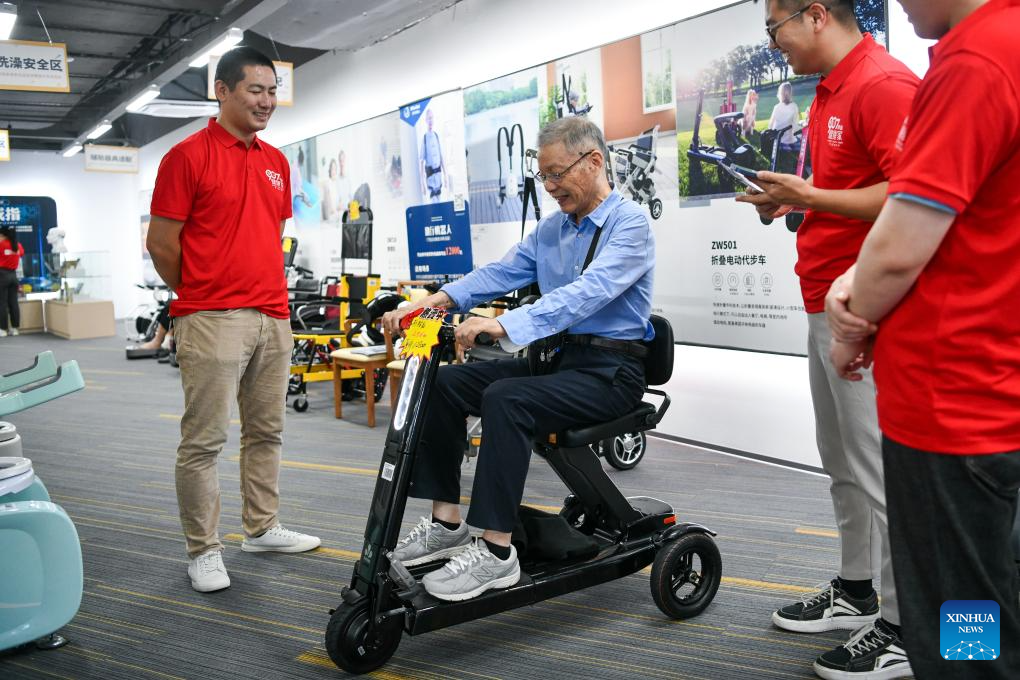 A customer tries an electric mobility scooter at an elderly product mall in Shenzhen, south China's Guangdong Province, Oct. 12, 2024. The elderly product mall in Shenzhen opened to the public recently, showcasing hundreds of smart home products under categories of home safety, entertainment, and intelligent caretaking, etc., meeting the citizens' needs for aging-friendly home renovation and living quality improvement. (Xinhua/Liang Xu)