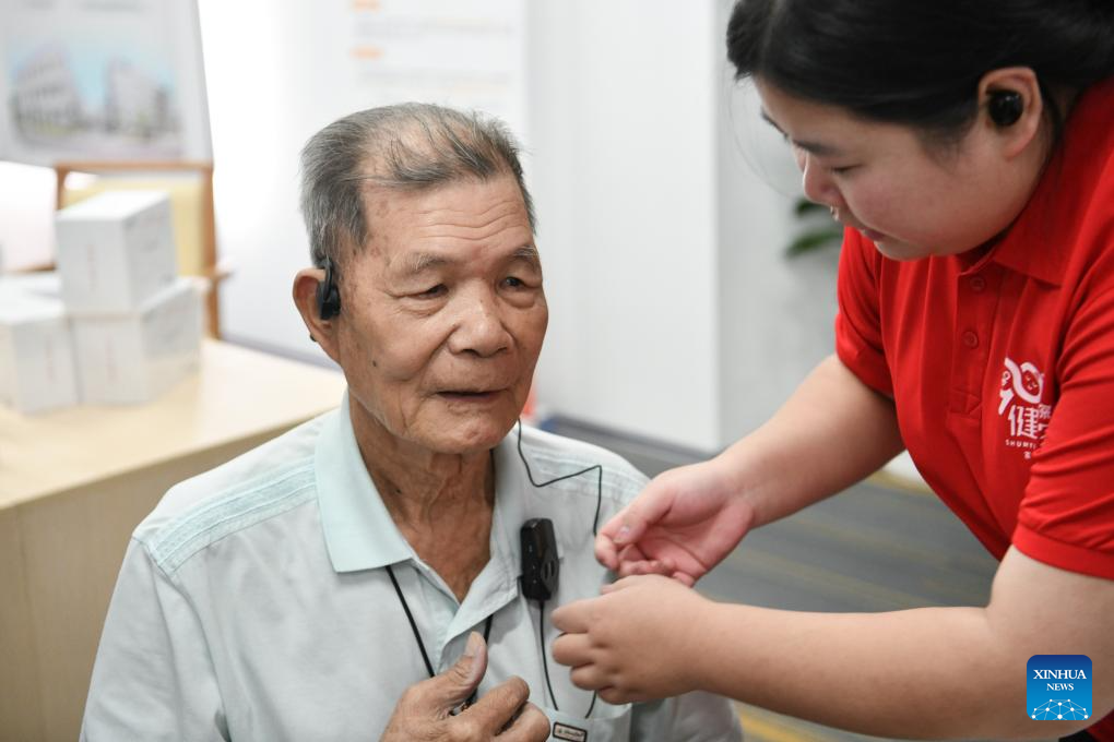 A customer tries a bone conduction hearing aid at an elderly product mall in Shenzhen, south China's Guangdong Province, Oct. 12, 2024. The elderly product mall in Shenzhen opened to the public recently, showcasing hundreds of smart home products under categories of home safety, entertainment, and intelligent caretaking, etc., meeting the citizens' needs for aging-friendly home renovation and living quality improvement. (Xinhua/Liang Xu)