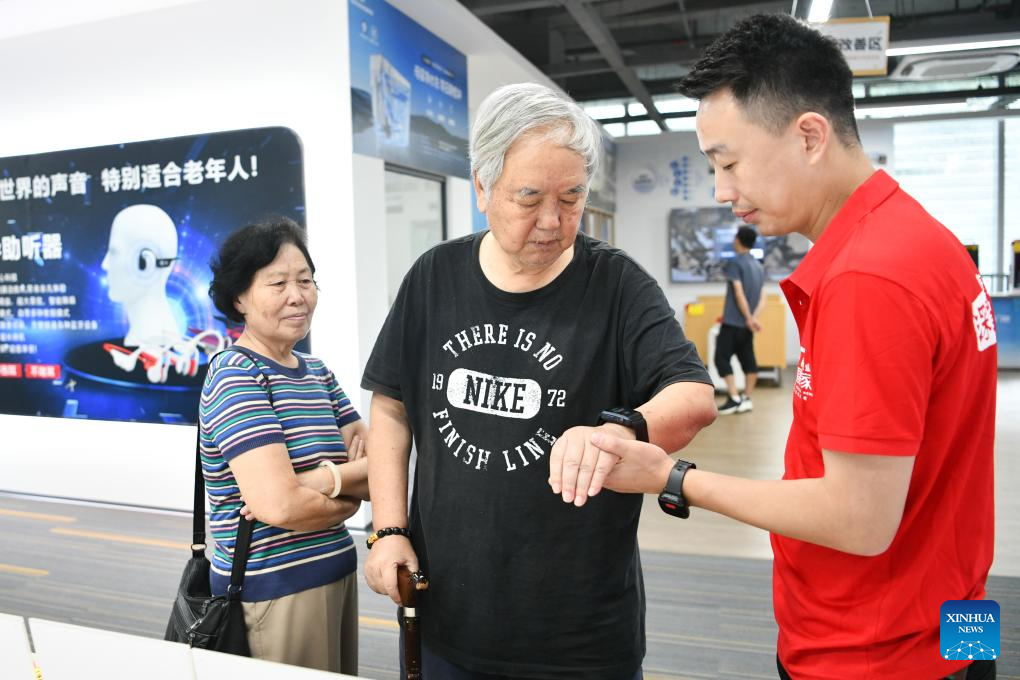 A customer tests his blood pressure with a smartwatch at an elderly product mall in Shenzhen, south China's Guangdong Province, Oct. 12, 2024. The elderly product mall in Shenzhen opened to the public recently, showcasing hundreds of smart home products under categories of home safety, entertainment, and intelligent caretaking, etc., meeting the citizens' needs for aging-friendly home renovation and living quality improvement. (Xinhua/Liang Xu)