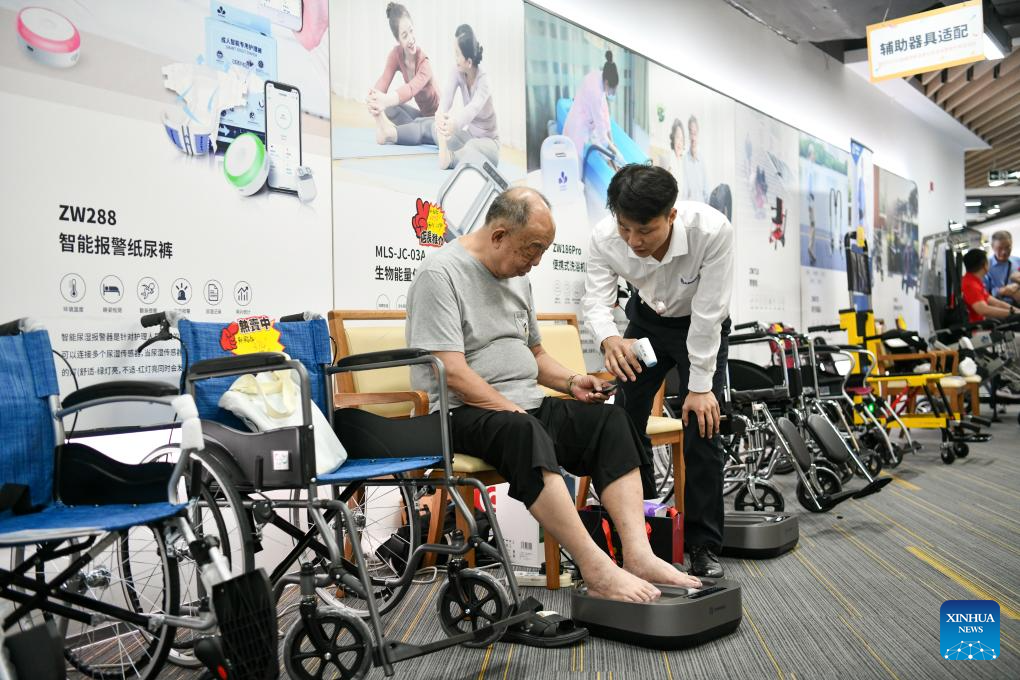 A customer tries a physiotherapy apparatus at an elderly product mall in Shenzhen, south China's Guangdong Province, Oct. 12, 2024. The elderly product mall in Shenzhen opened to the public recently, showcasing hundreds of smart home products under categories of home safety, entertainment, and intelligent caretaking, etc., meeting the citizens' needs for aging-friendly home renovation and living quality improvement. (Xinhua/Liang Xu)