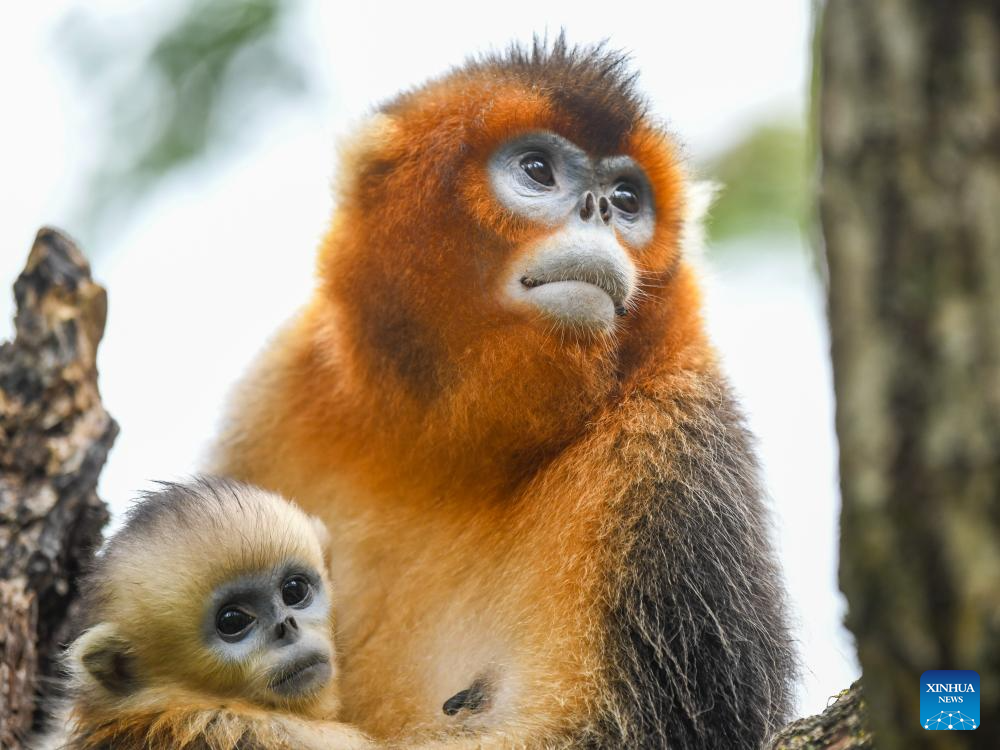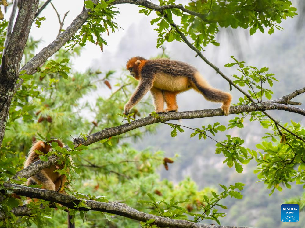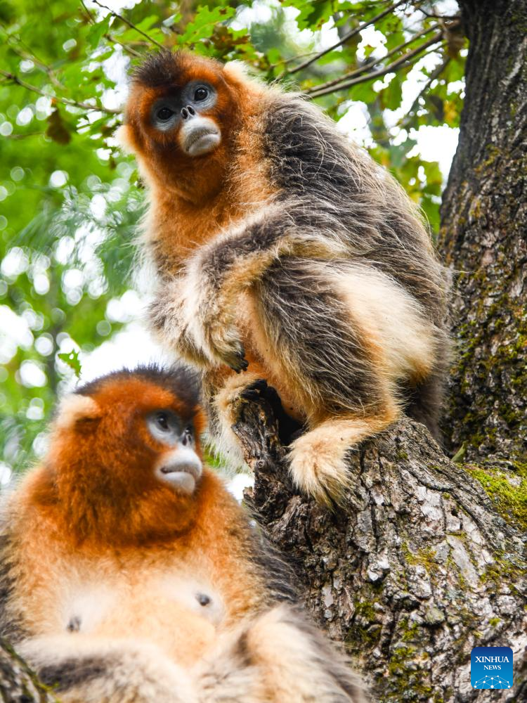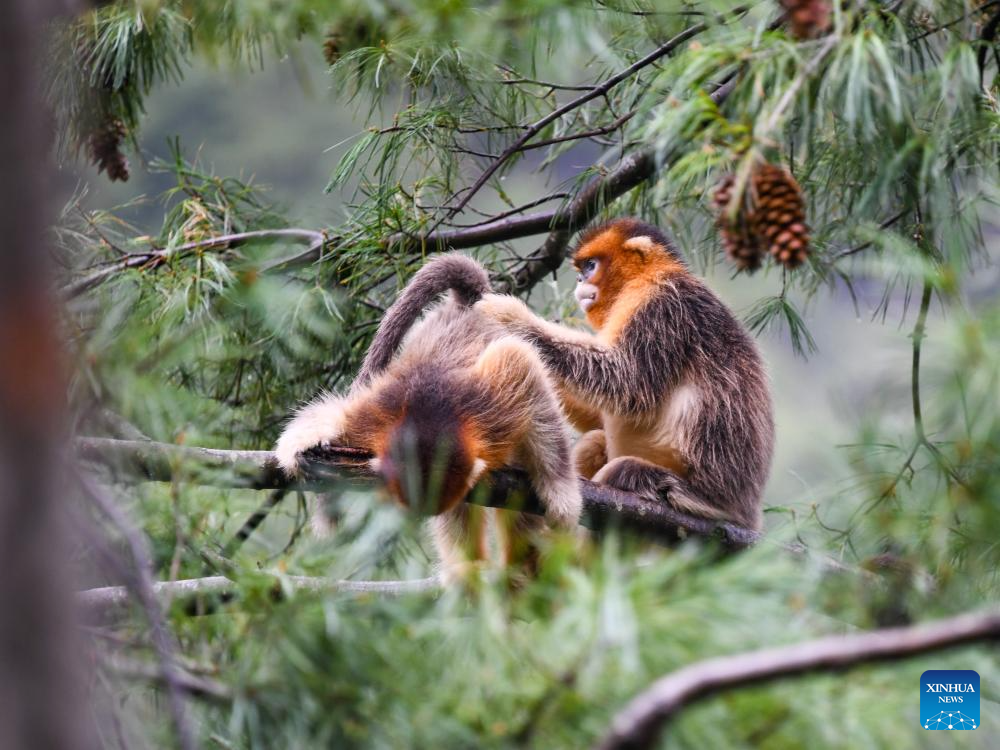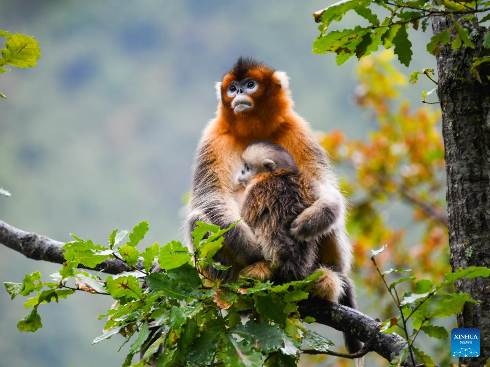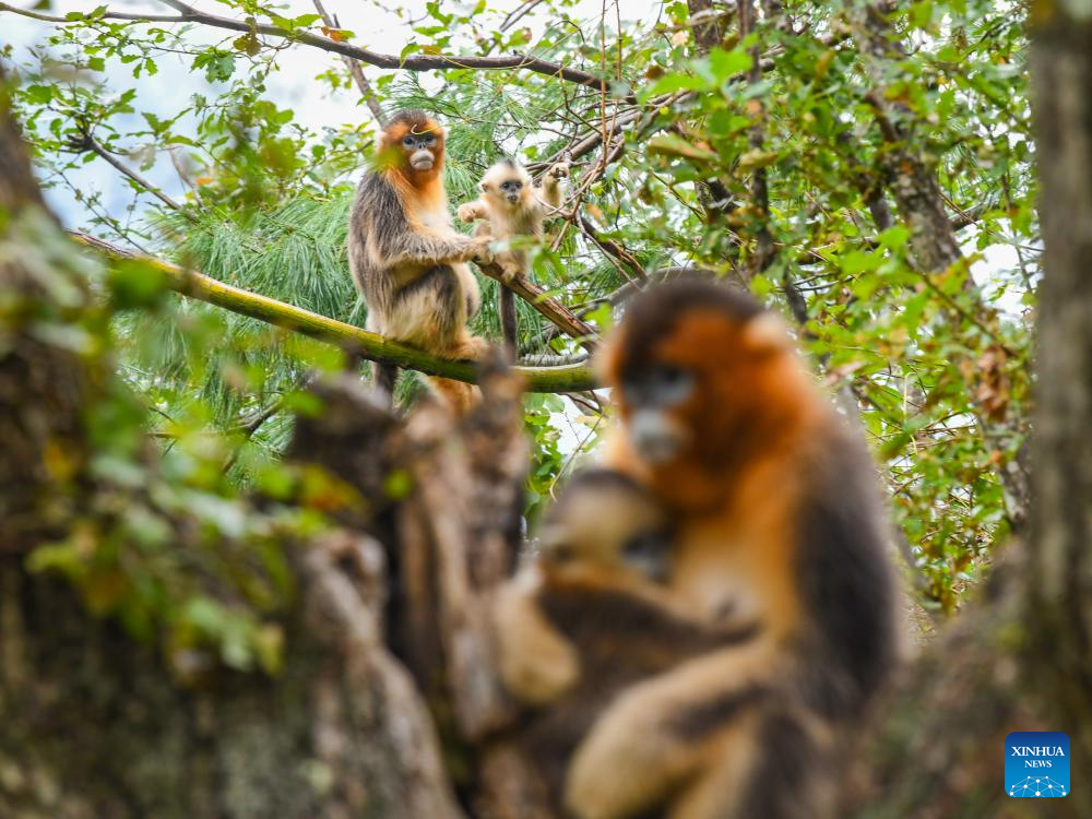 Sichuan golden snub-nosed monkeys are pictured at Baihe National Nature Reserve in Jiuzhaigou County, southwest China's Sichuan Province, Oct. 11, 2024. Located in Jiuzhaigou County of Aba Tibetan and Qiang Autonomous Prefecture in southwest China's Sichuan Province, Baihe National Nature Reserve is home to about 1,700 Sichuan golden snub-nosed monkeys. Thanks to the continuous efforts in the protection of the monkeys' habitat, the ecological environment in this region has continued to improve in recent years. (Xinhua/Wang Xi)