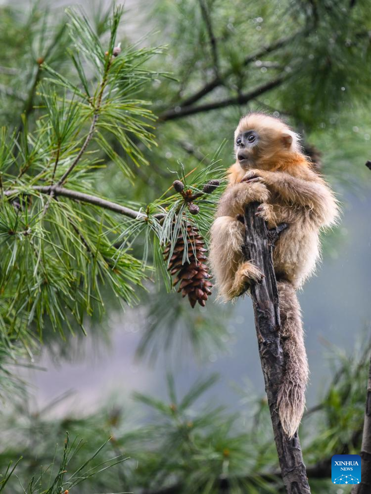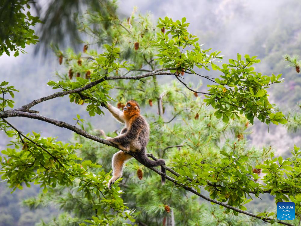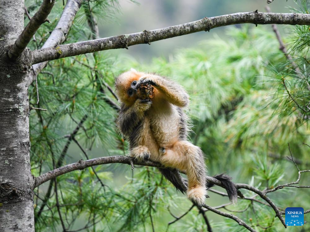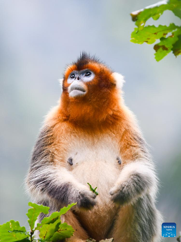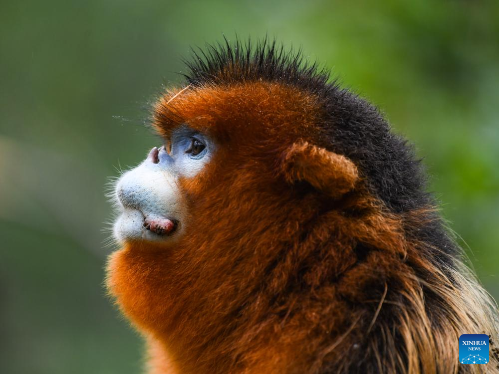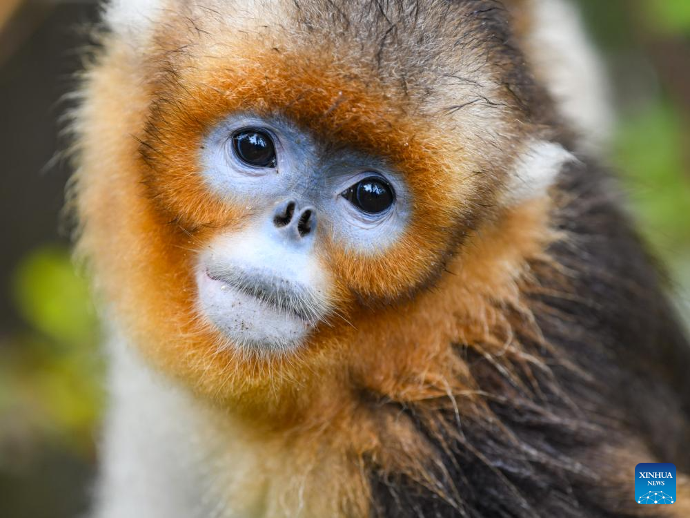 A Sichuan golden snub-nosed monkey is pictured at Baihe National Nature Reserve in Jiuzhaigou County, southwest China's Sichuan Province, Oct. 11, 2024. Located in Jiuzhaigou County of Aba Tibetan and Qiang Autonomous Prefecture in southwest China's Sichuan Province, Baihe National Nature Reserve is home to about 1,700 Sichuan golden snub-nosed monkeys. Thanks to the continuous efforts in the protection of the monkeys' habitat, the ecological environment in this region has continued to improve in recent years. (Xinhua/Wang Xi)
