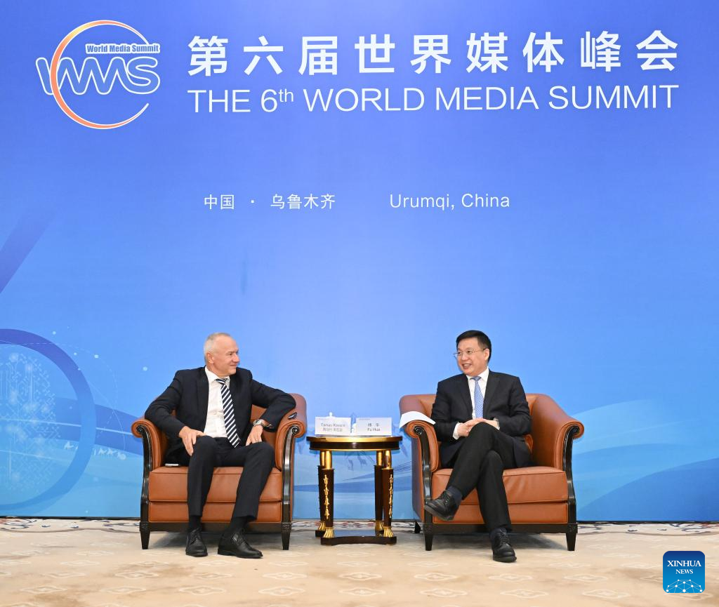 Fu Hua, president of Xinhua News Agency, meets with Tamas Kovacs, CEO of Hungary's ATV Media Group, who is here to attend the 6th World Media Summit in Urumqi, northwest China's Xinjiang Uygur Autonomous Region, Oct. 13, 2024. (Xinhua/Li Xiang)