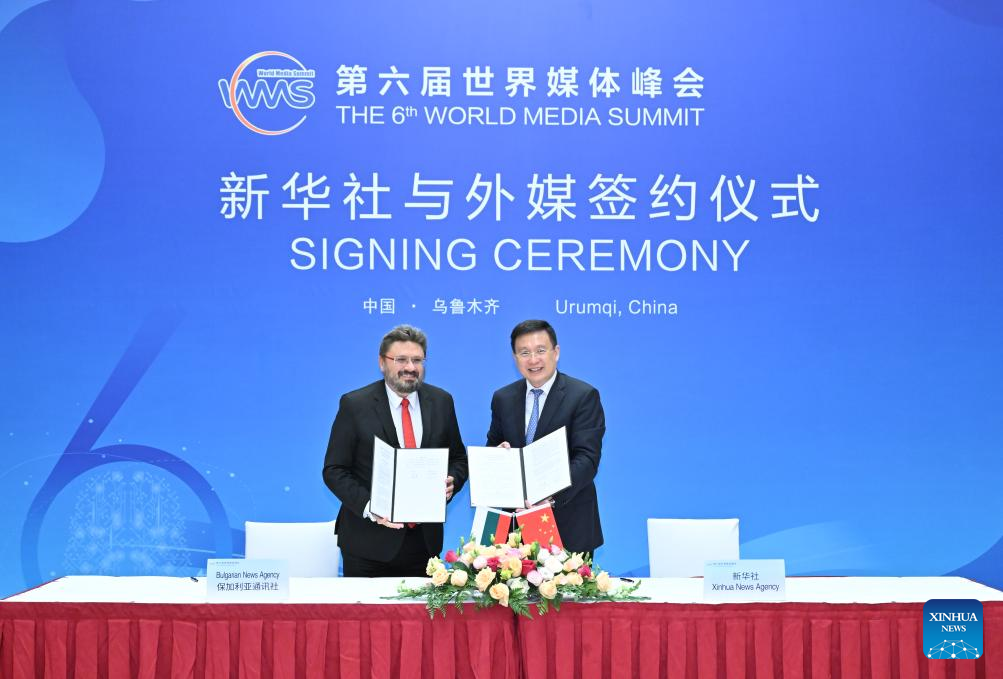 Fu Hua, president of Xinhua News Agency, attends a signing ceremony with the Bulgarian News Agency during the 6th World Media Summit in Urumqi, northwest China's Xinjiang Uygur Autonomous Region, Oct. 13, 2024. (Xinhua/Li Xiang)
