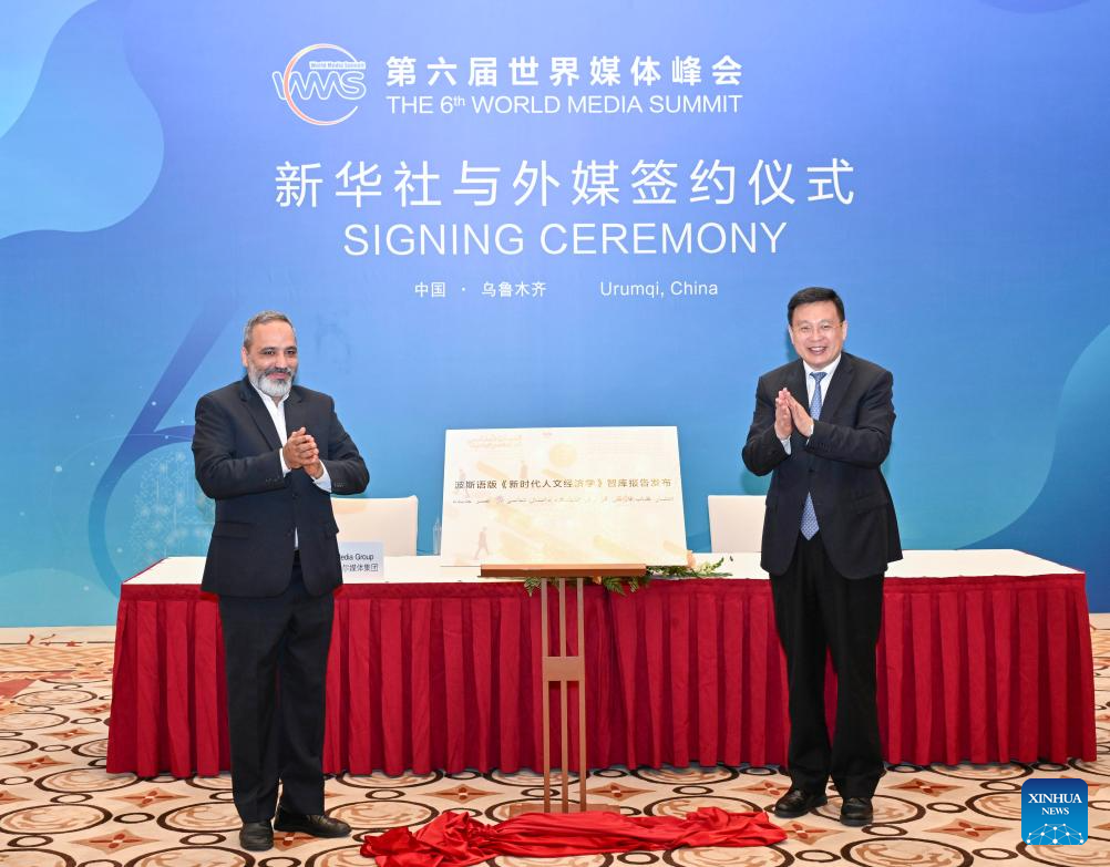 Fu Hua, president of Xinhua News Agency, attends a signing ceremony with Iran's Mehr Media Group during the 6th World Media Summit in Urumqi, northwest China's Xinjiang Uygur Autonomous Region, Oct. 13, 2024. (Xinhua/Hu Huhu)