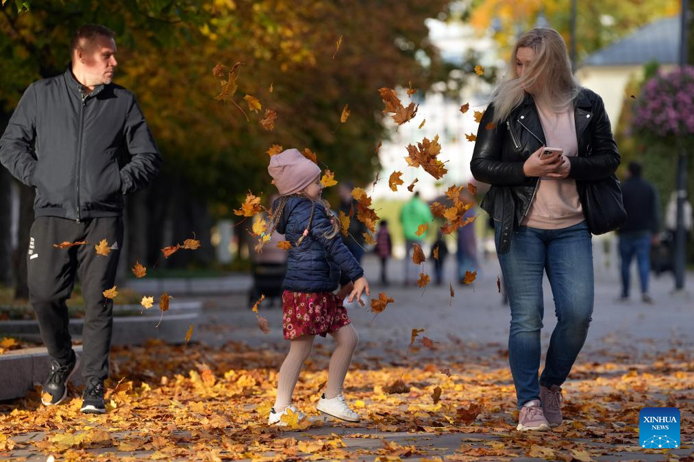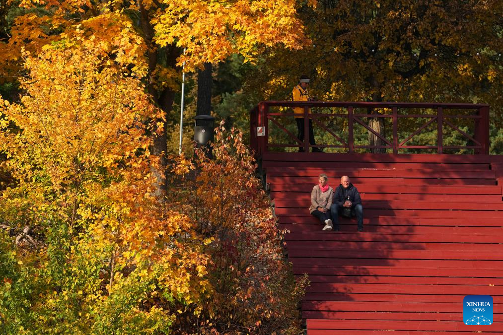 People enjoy the autumn scenery in Ogre, Latvia, Oct. 13, 2024. (Photo by Edijs Palens/Xinhua)