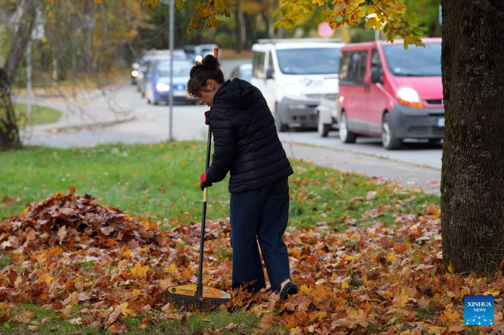 A woman rakes fallen leaves in Ogre, Latvia, Oct. 13, 2024. (Photo by Edijs Palens/Xinhua)