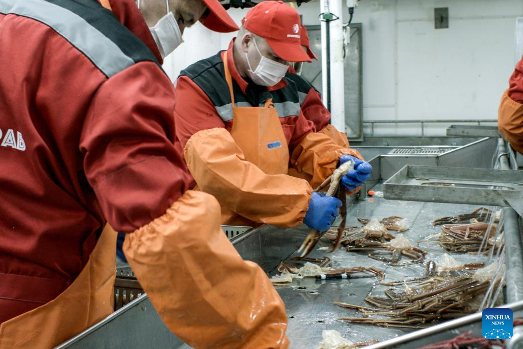 This undated file photo shows workers processing seafood on a production line of Russian Crab group in Russia. Hunchun City of northeast China's Jilin Province has a nickname "capital of king crabs" among netizens. Every day, trucks fully loaded with fresh seafood imports enter the city via a land checkpoint bordering Russia. The Russian king crab, also known as the Kamchatka crab, is the star product.