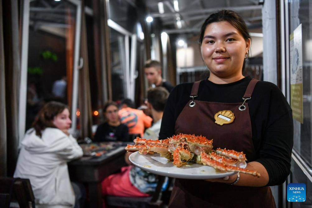 A waitress showcases a king crab at a restaurant in Vladivostok, Russia, Sept. 2, 2024. Hunchun City of northeast China's Jilin Province has a nickname "capital of king crabs" among netizens. Every day, trucks fully loaded with fresh seafood imports enter the city via a land checkpoint bordering Russia. The Russian king crab, also known as the Kamchatka crab, is the star product.