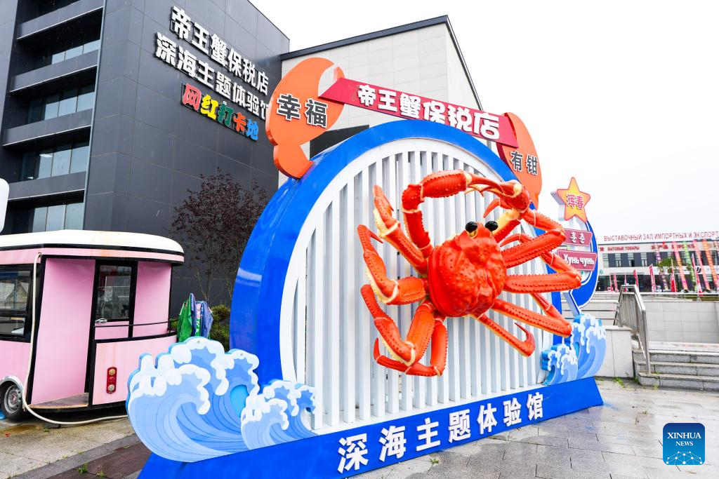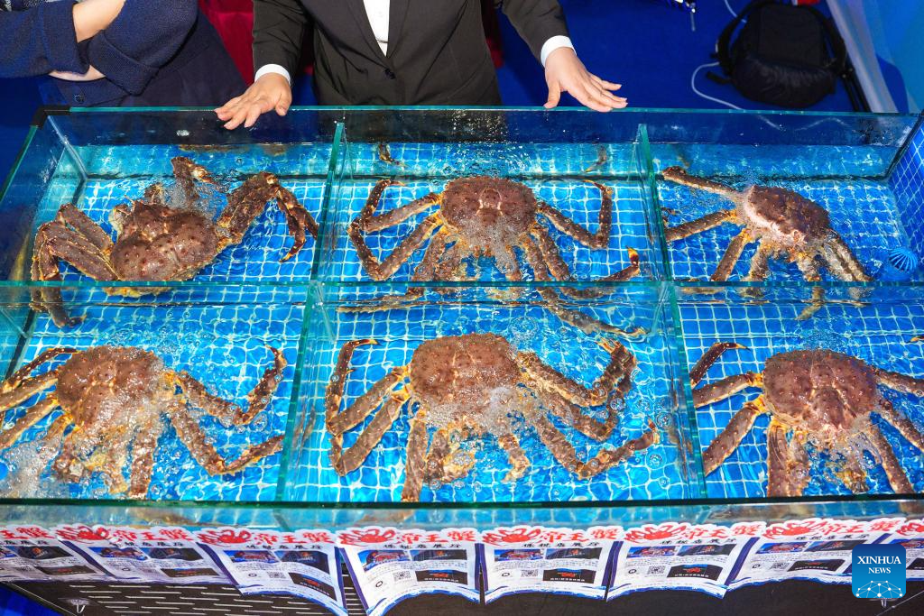 Russian king crabs have not only enriched Chinese people's diets but also promoted cooperation and development in the border areas between China and Russia. At the Northeast Asia Cross-Border E-commerce Industrial Park in Hunchun, a king crab shop covering an area of over 1,000 square meters opened earlier this year. Wang Hai, the shop's executive, stated that they have established deep cooperation with the Russian Crab Group to provide high quality king crabs. Since its opening, the shop has attracted many customers, with a peak daily reception of more than 10,000 visitors. (Xinhua/Xu Chang)