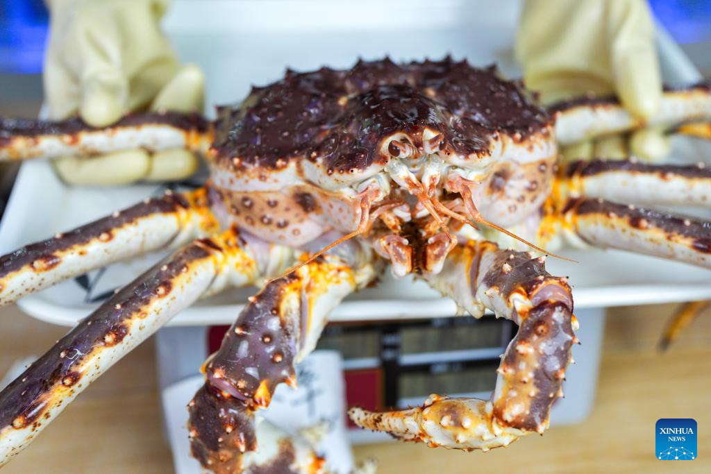 Russian king crabs have not only enriched Chinese people's diets but also promoted cooperation and development in the border areas between China and Russia. At the Northeast Asia Cross-Border E-commerce Industrial Park in Hunchun, a king crab shop covering an area of over 1,000 square meters opened earlier this year. Wang Hai, the shop's executive, stated that they have established deep cooperation with the Russian Crab Group to provide high quality king crabs. Since its opening, the shop has attracted many customers, with a peak daily reception of more than 10,000 visitors. (Russian Crab Group/Handout via Xinhua)