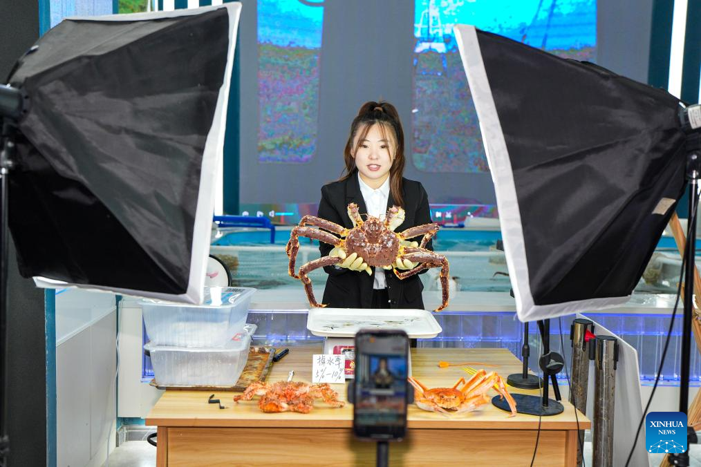 A staff member promotes king crabs via livestreaming at a shop in Hunchun, northeast China's Jilin Province, Sept. 20, 2024. Hunchun City of northeast China's Jilin Province has a nickname "capital of king crabs" among netizens. Every day, trucks fully loaded with fresh seafood imports enter the city via a land checkpoint bordering Russia. The Russian king crab, also known as the Kamchatka crab, is the star product.