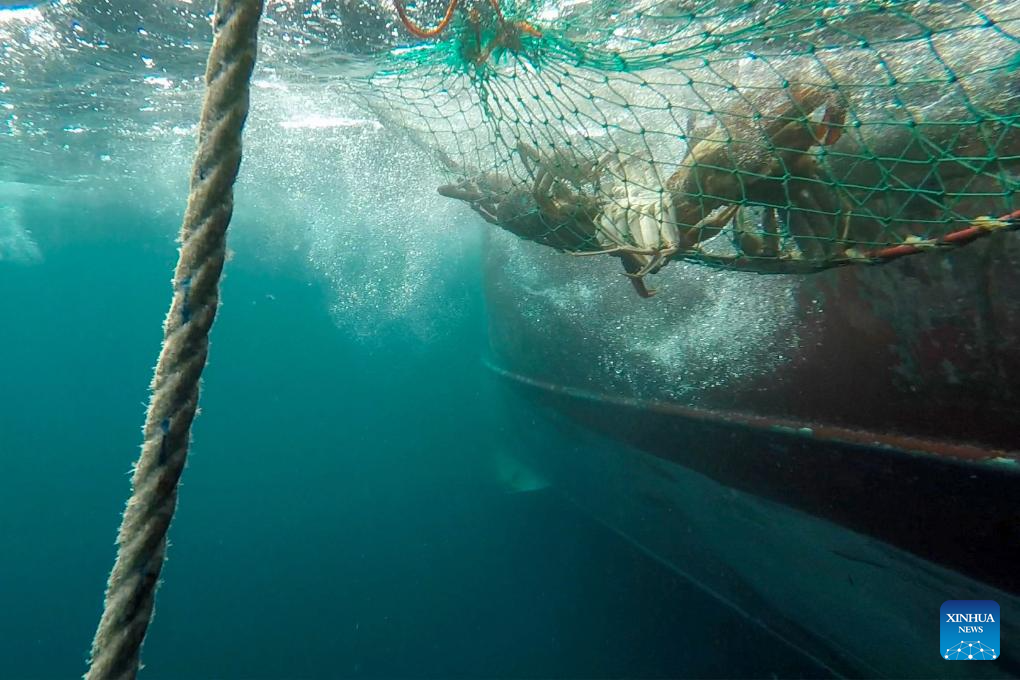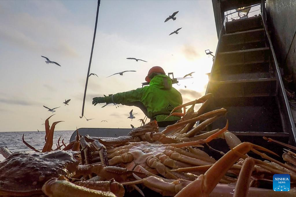 This undated file photo shows a staff member of Russian Crab Group conducting deep-sea fishing. Hunchun City of northeast China's Jilin Province has a nickname "capital of king crabs" among netizens. Every day, trucks fully loaded with fresh seafood imports enter the city via a land checkpoint bordering Russia. The Russian king crab, also known as the Kamchatka crab, is the star product.