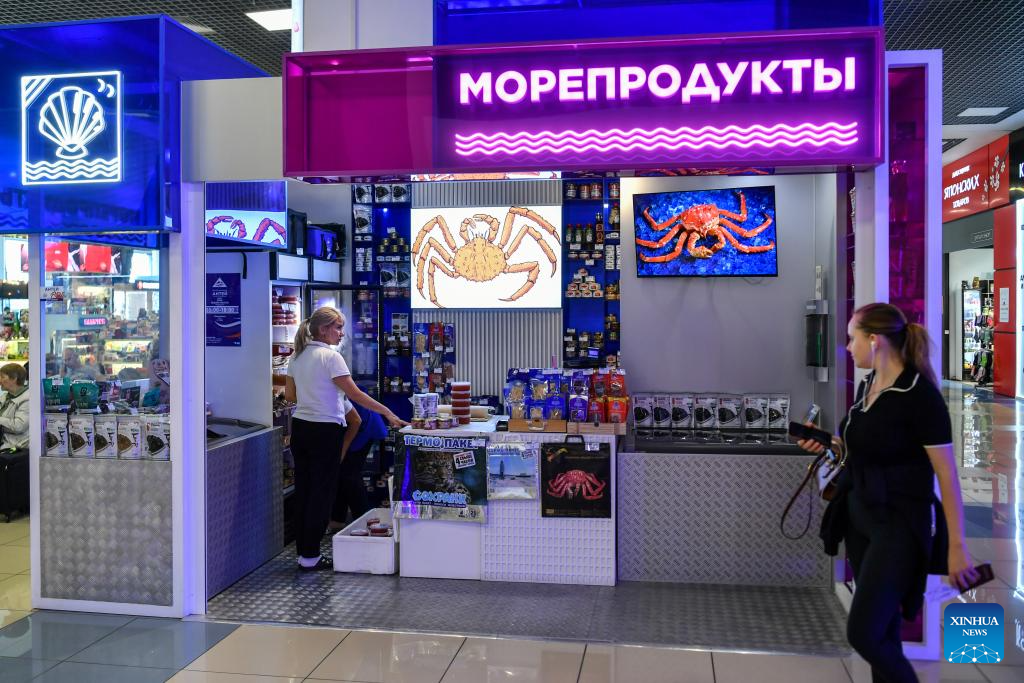 This photo taken on Sept. 6, 2024 shows a seafood store at the Vladivostok International Airport in Russia. Hunchun City of northeast China's Jilin Province has a nickname "capital of king crabs" among netizens. Every day, trucks fully loaded with fresh seafood imports enter the city via a land checkpoint bordering Russia. The Russian king crab, also known as the Kamchatka crab, is the star product.