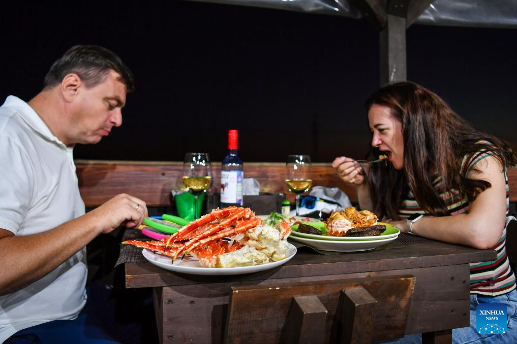 People taste king crabs at a restaurant in Vladivostok, Russia, Sept. 2, 2024. Hunchun City of northeast China's Jilin Province has a nickname "capital of king crabs" among netizens. Every day, trucks fully loaded with fresh seafood imports enter the city via a land checkpoint bordering Russia. The Russian king crab, also known as the Kamchatka crab, is the star product.
