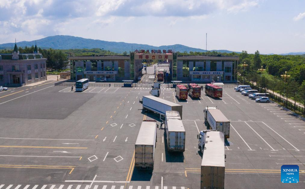 This aerial drone photo taken on June 22, 2019 shows trucks waiting to pass the land port in Hunchun, northeast China's Jilin Province. Hunchun City of northeast China's Jilin Province has a nickname "capital of king crabs" among netizens. Every day, trucks fully loaded with fresh seafood imports enter the city via a land checkpoint bordering Russia. The Russian king crab, also known as the Kamchatka crab, is the star product.