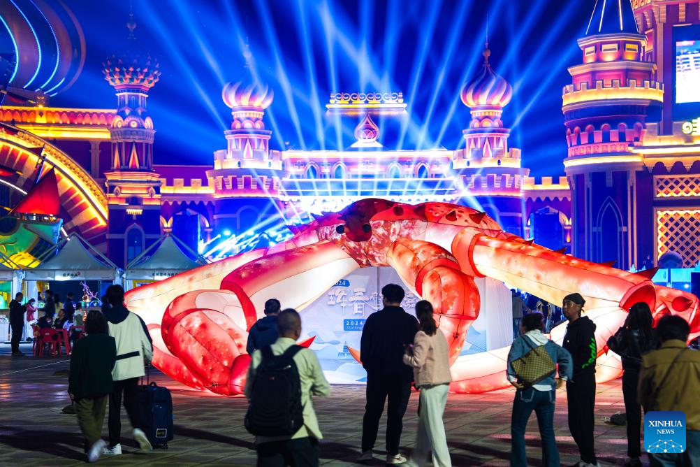 Tourists have fun at a carnival themed on king crabs in Hunchun, northeast China's Jilin Province, Sept. 19, 2024. Hunchun City of northeast China's Jilin Province has a nickname "capital of king crabs" among netizens. Every day, trucks fully loaded with fresh seafood imports enter the city via a land checkpoint bordering Russia. The Russian king crab, also known as the Kamchatka crab, is the star product.