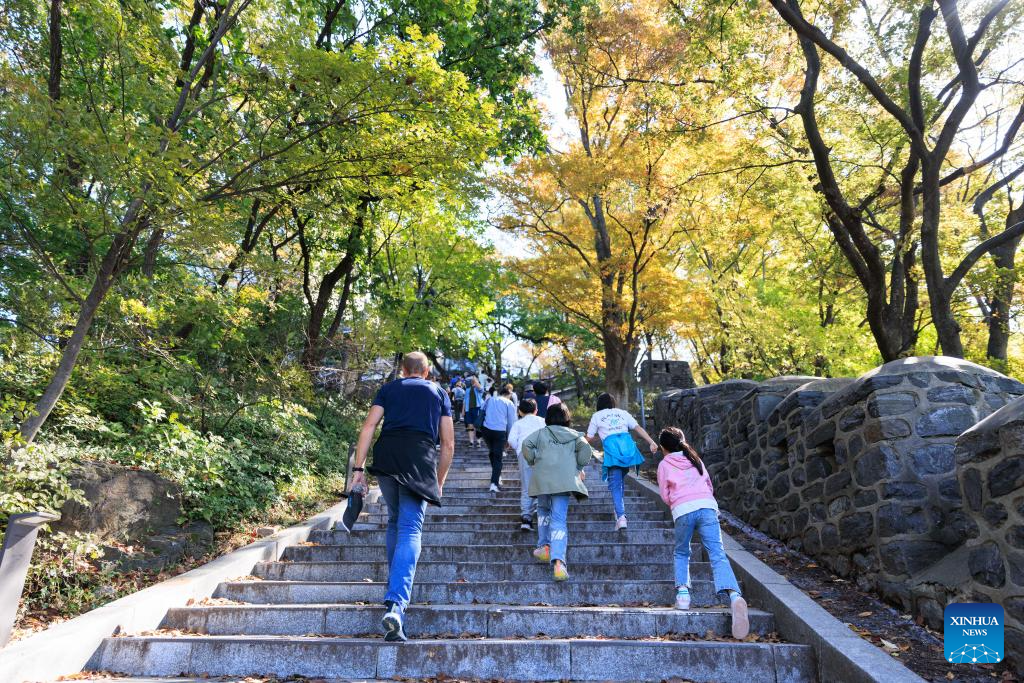 People climb the mountain at Namsan Park in Seoul, South Korea, Oct. 20, 2024. (Photo by JINTAEK/Xinhua)