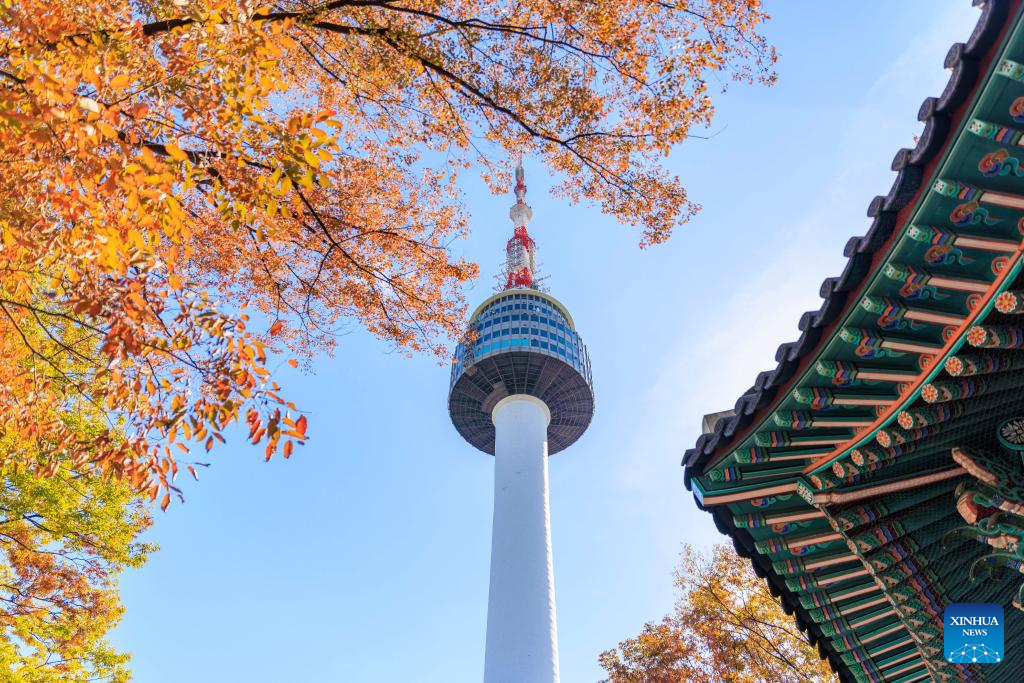 This photo taken on Oct. 20, 2024 shows the Namsan Seoul Tower amid autumn trees in Seoul, South Korea. (Photo by JINTAEK/Xinhua)