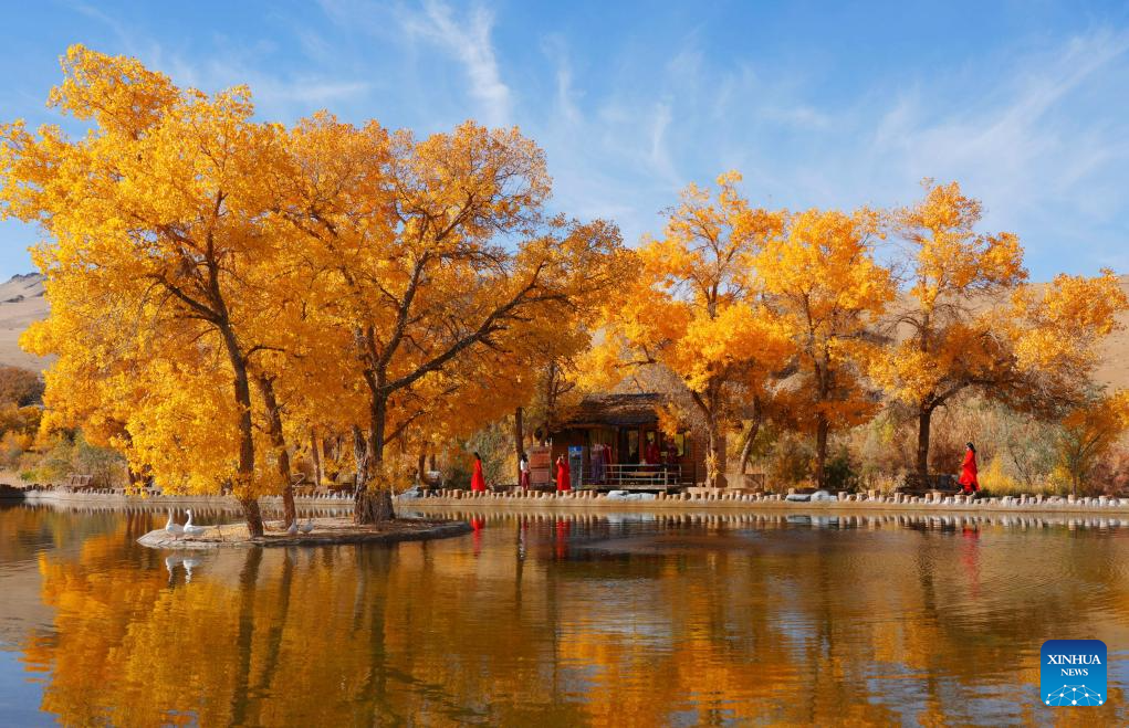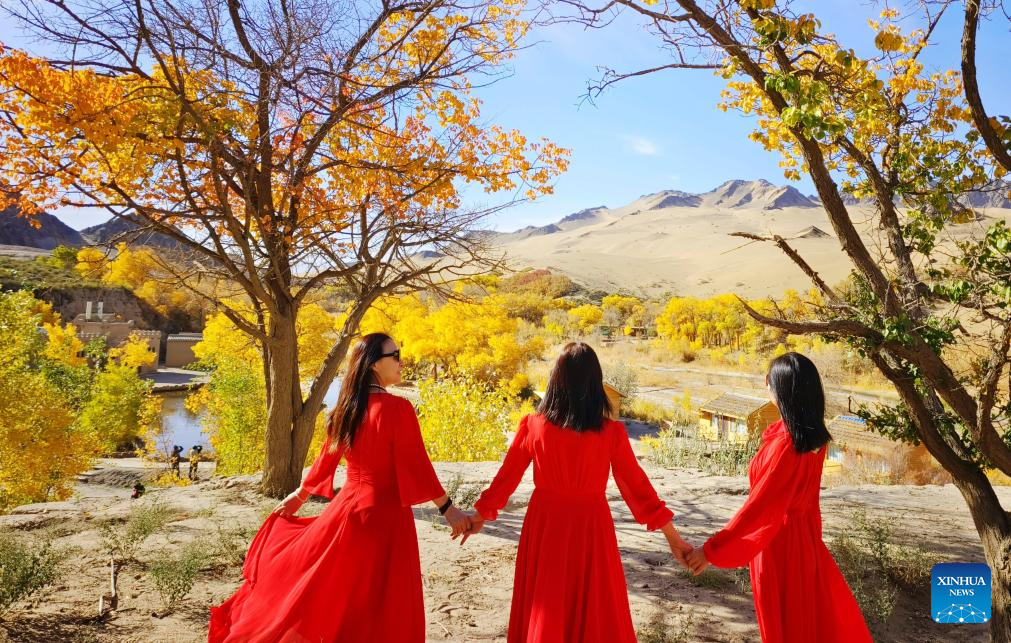 People visit the Huyangxia scenic spot in the Kazak Autonomous County of Aksay in northwest China's Gansu Province, Oct. 14, 2024. (Photo by Ma Xiaowei/Xinhua)