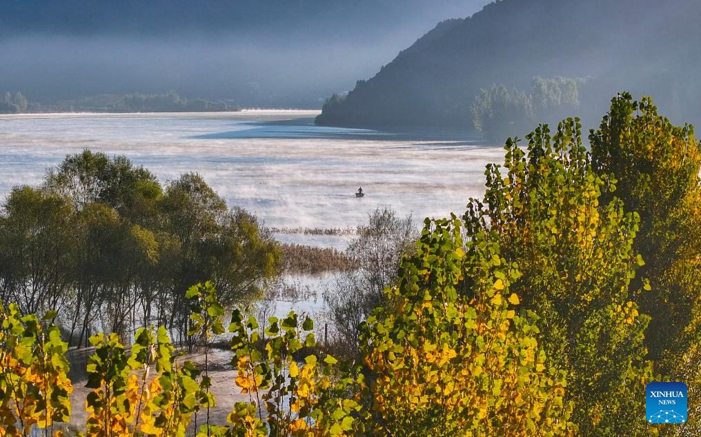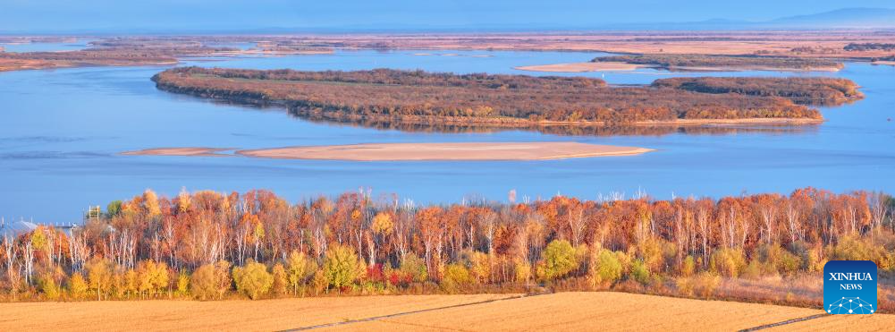An aerial drone photo taken on Oct. 13, 2024 shows the autumn scenery at the Sanjiangkou ecological tourism area in Tongjiang City, northeast China's Heilongjiang Province. (Photo by Xu Congjun/Xinhua)