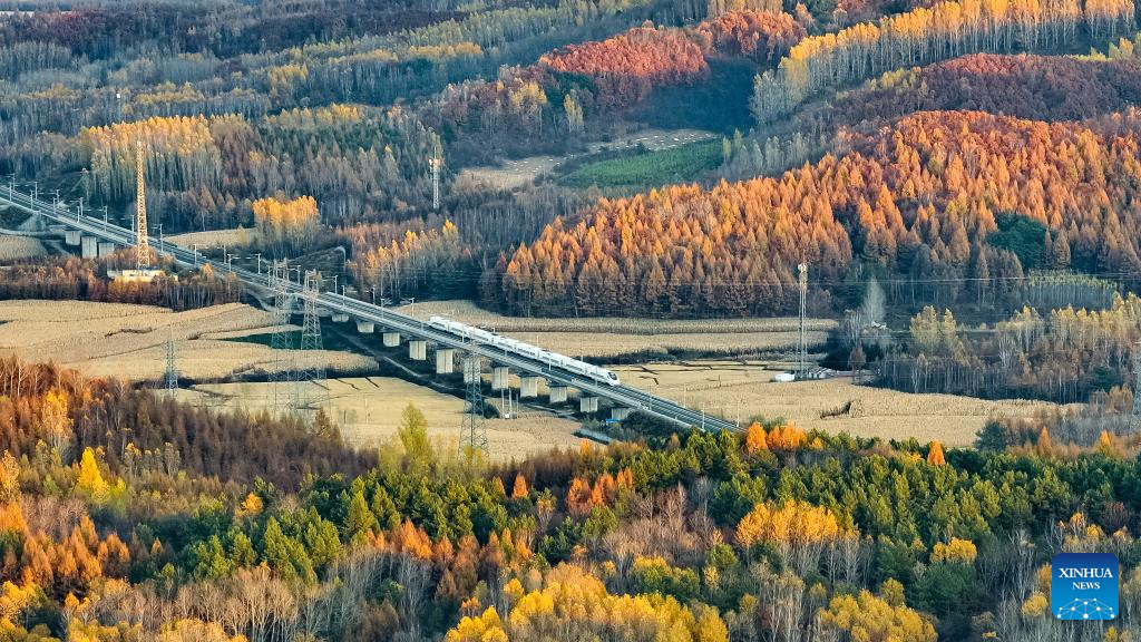 An aerial drone photo taken on Oct. 13, 2024 shows a train passing forest and fields in Shangzhi City, northeast China's Heilongjiang Province. (Photo by Yuan Yong/Xinhua)