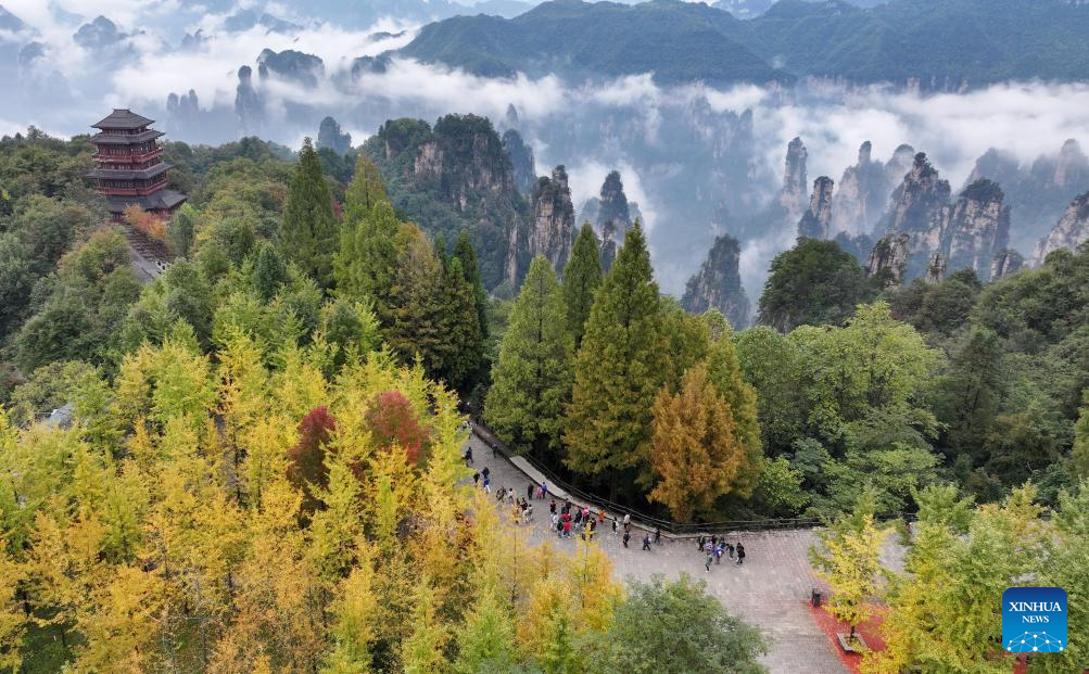 An aerial drone photo taken on Oct. 14, 2024 shows the autumn scenery of Tianzi Mountain at the Zhangjiajie national forest park in Zhangjiajie, central China's Hunan Province. (Photo by Wu Yongbing/Xinhua)