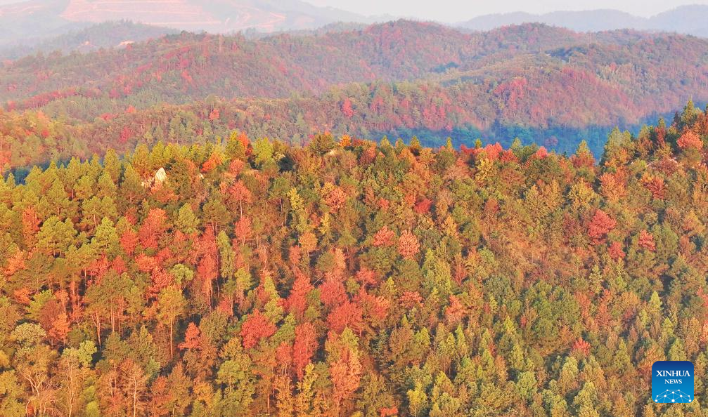 An aerial drone photo taken on Oct. 31, 2024 shows the autumn scenery in Hengshan County of Hengyang, central China's Hunan Province. (Photo by Cao Zhengping/Xinhua)