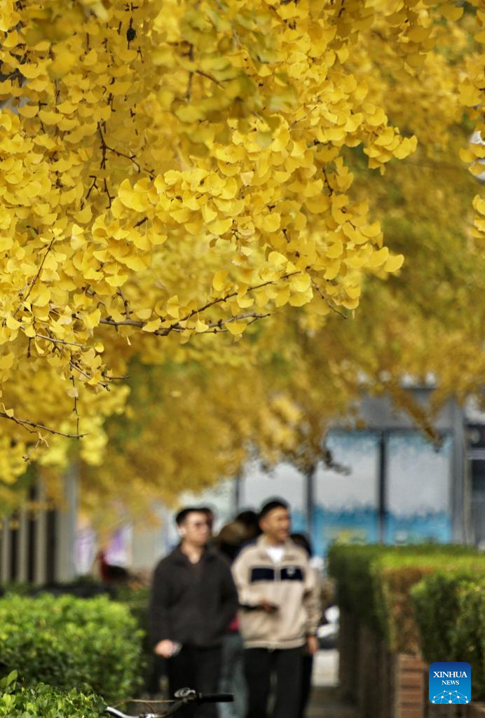 People enjoy the autumn scenery at the Olympic forest park in Beijing, capital of China, Oct. 31, 2024. (Xinhua/Li Xin)