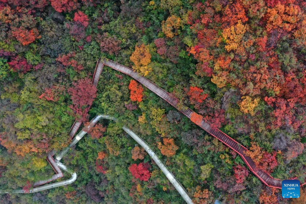 An aerial drone photo taken on Oct. 31, 2024 shows the autumn scenery in Qinyang, central China's Henan Province. (Photo by Yang Fan/Xinhua)