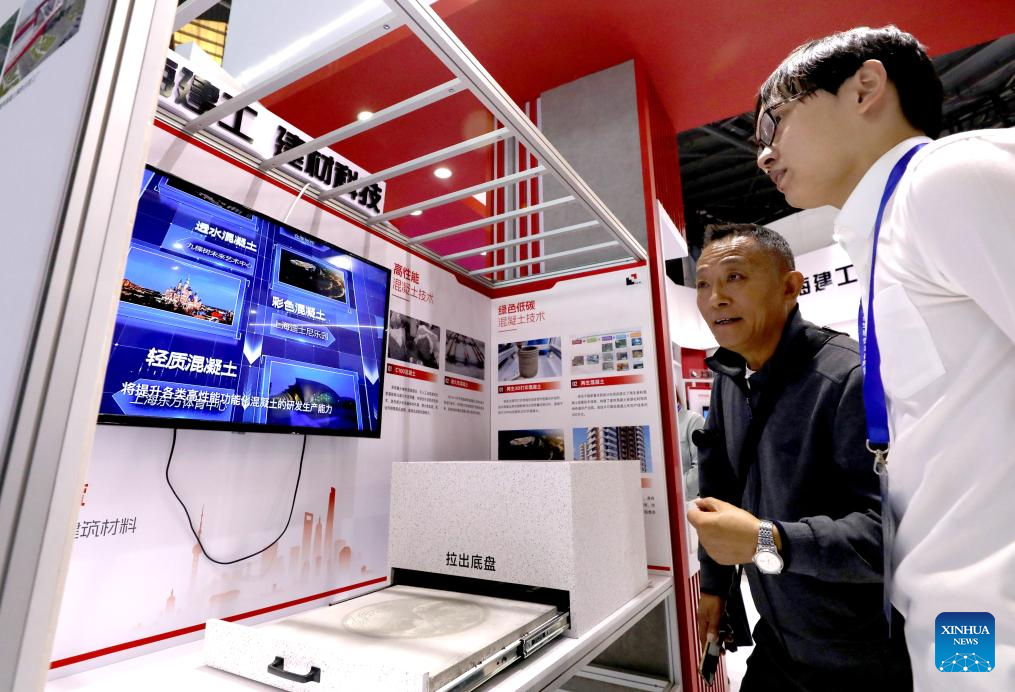 Visitors exchange ideas in front of a stand displaying new concrete technologies at an exhibition of 2024 World Cities Day China Observance and 2024 SDG Cities Global Conference in Shanghai, east China, Oct. 31, 2024. World Cities Day emerged from the 2010 Shanghai World Expo, specifically the Shanghai Declaration, which advocated for the idea of "Better City, Better Life." Celebrated annually on Oct. 31, the day promotes international urban dialogue.