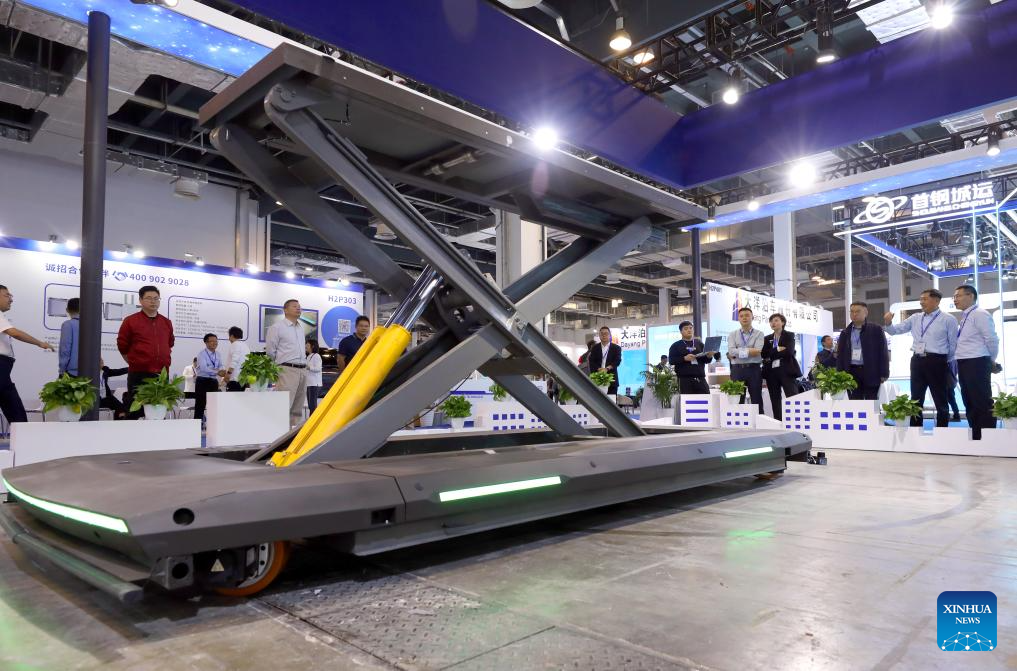 Visitors watch a demonstration of an AGV intelligent transporter for vehicles in parking garages at an exhibition of 2024 World Cities Day China Observance and 2024 SDG Cities Global Conference in Shanghai, east China, Oct. 31, 2024. World Cities Day emerged from the 2010 Shanghai World Expo, specifically the Shanghai Declaration, which advocated for the idea of "Better City, Better Life." Celebrated annually on Oct. 31, the day promotes international urban dialogue.