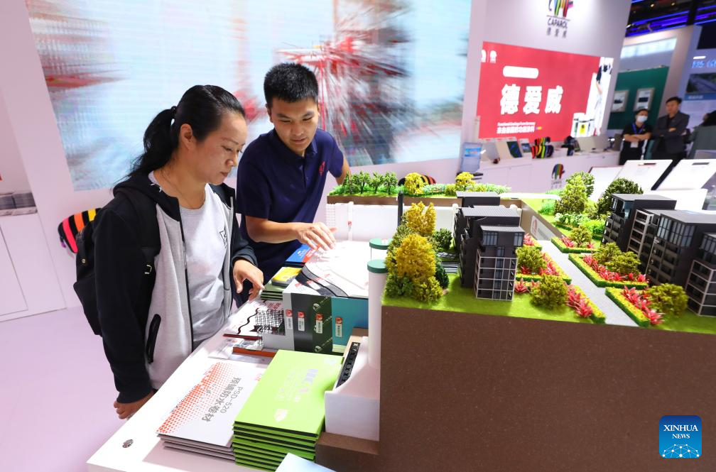 A visitor (R) learns about new building materials at an exhibition of 2024 World Cities Day China Observance and 2024 SDG Cities Global Conference in Shanghai, east China, Oct. 31, 2024. World Cities Day emerged from the 2010 Shanghai World Expo, specifically the Shanghai Declaration, which advocated for the idea of "Better City, Better Life." Celebrated annually on Oct. 31, the day promotes international urban dialogue.
