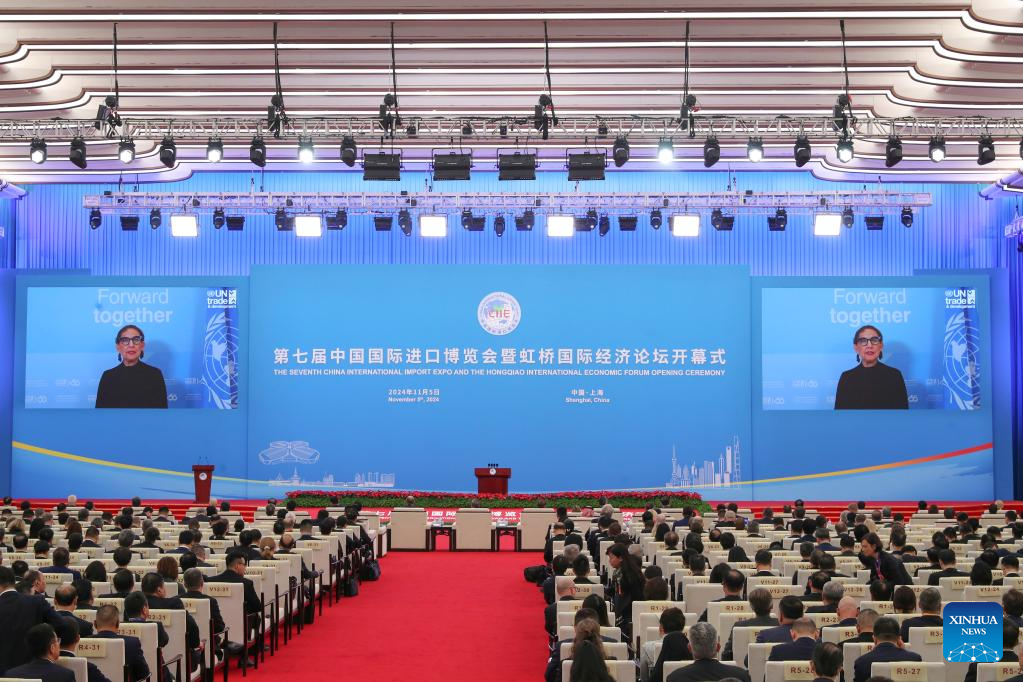 Rebeca Grynspan, secretary-general of the United Nations Conference on Trade and Development (UNCTAD), delivers a video speech during the opening ceremony of the seventh China International Import Expo (CIIE) and the Hongqiao International Economic Forum at the National Exhibition and Convention Center (Shanghai) in east China's Shanghai, Nov. 5, 2024. (Xinhua/Fang Zhe)