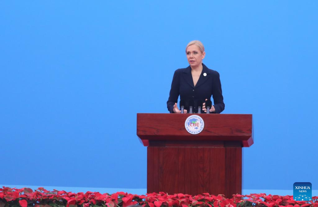Slovak Deputy Prime Minister Denisa Sakova addresses the opening ceremony of the seventh China International Import Expo (CIIE) and the Hongqiao International Economic Forum at the National Exhibition and Convention Center (Shanghai) in east China's Shanghai, Nov. 5, 2024. (Xinhua/Fang Zhe)