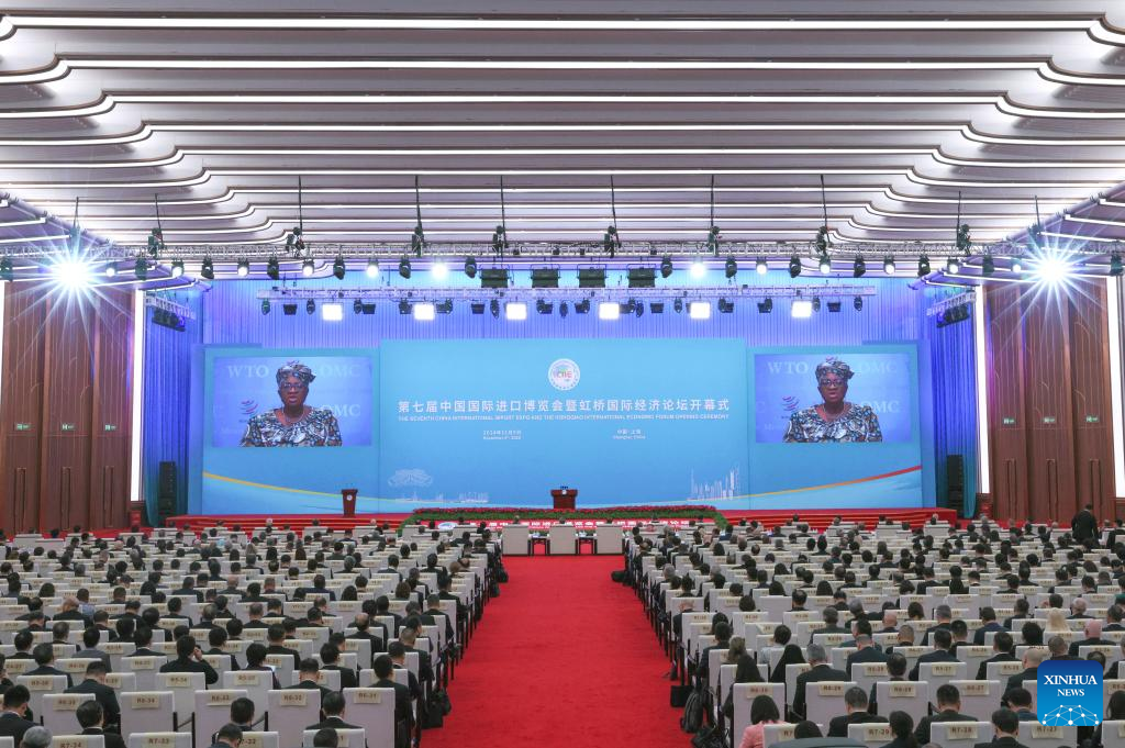 Director-General of the World Trade Organization (WTO) Ngozi Okonjo-Iweala delivers a video speech during the opening ceremony of the seventh China International Import Expo (CIIE) and the Hongqiao International Economic Forum at the National Exhibition and Convention Center (Shanghai) in east China's Shanghai, Nov. 5, 2024. (Xinhua/Yin Gang)